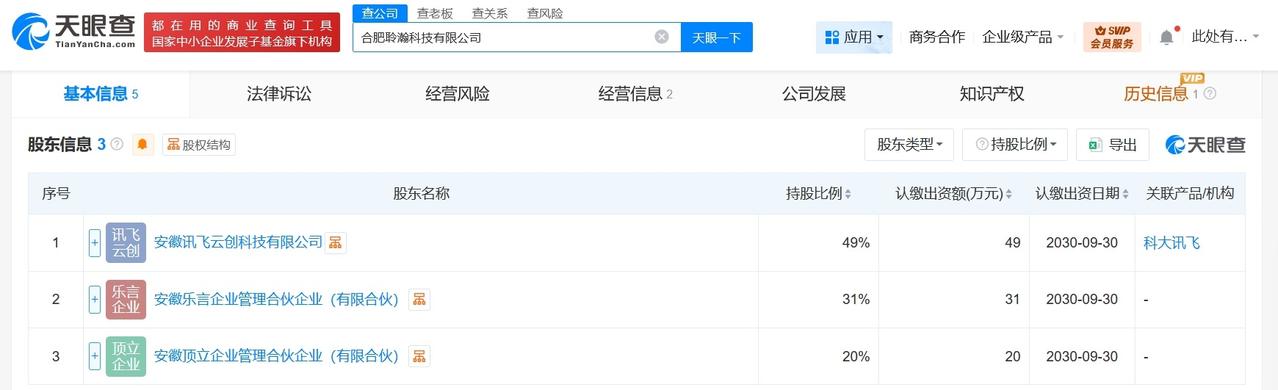 科大讯飞等成立聆瀚科技公司 天眼查App显示,近日,合肥聆瀚科技有限公司成立,法定代表人为孙淑芳,注册资本100万人民币,经营范围含工程和技术研究和试验发展、计算机系统服务、数据处理服务、软件开发、计算机软硬件及辅助设备批发、计算机软硬件及辅助设备零售、软件销售、信息系统集成服务、数据处理和存储支持服务等,由科大讯飞旗下安徽讯飞云创科技有限公司以及安徽乐言企业管理合伙企业(有限合伙)、安徽顶立企业管理合伙企业(有限合伙)共同持股。 天眼查信息: