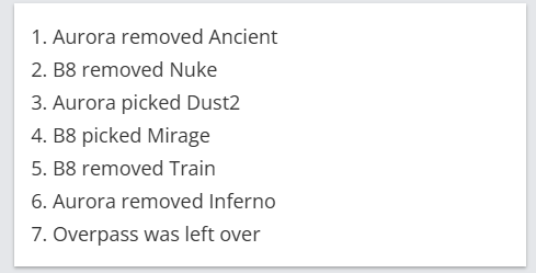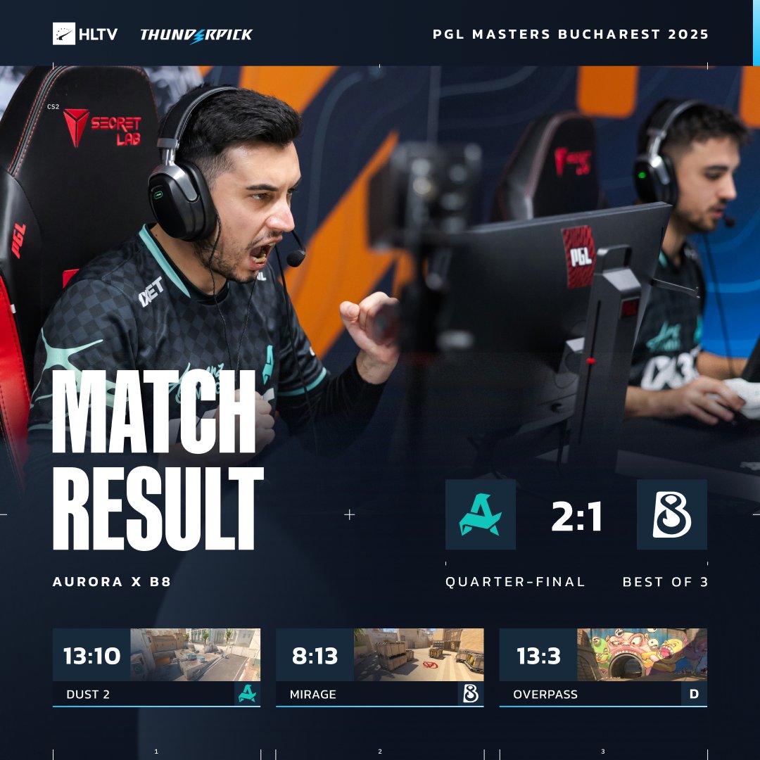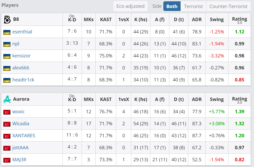 决胜图OverPassB8全队手感突然断电,Aurora全队找回手感且手感火热,XANTARES更是砍下2.04rating,凭借全队的出色发挥,Aurora以13-3大比分战胜B8晋级PGL四强
