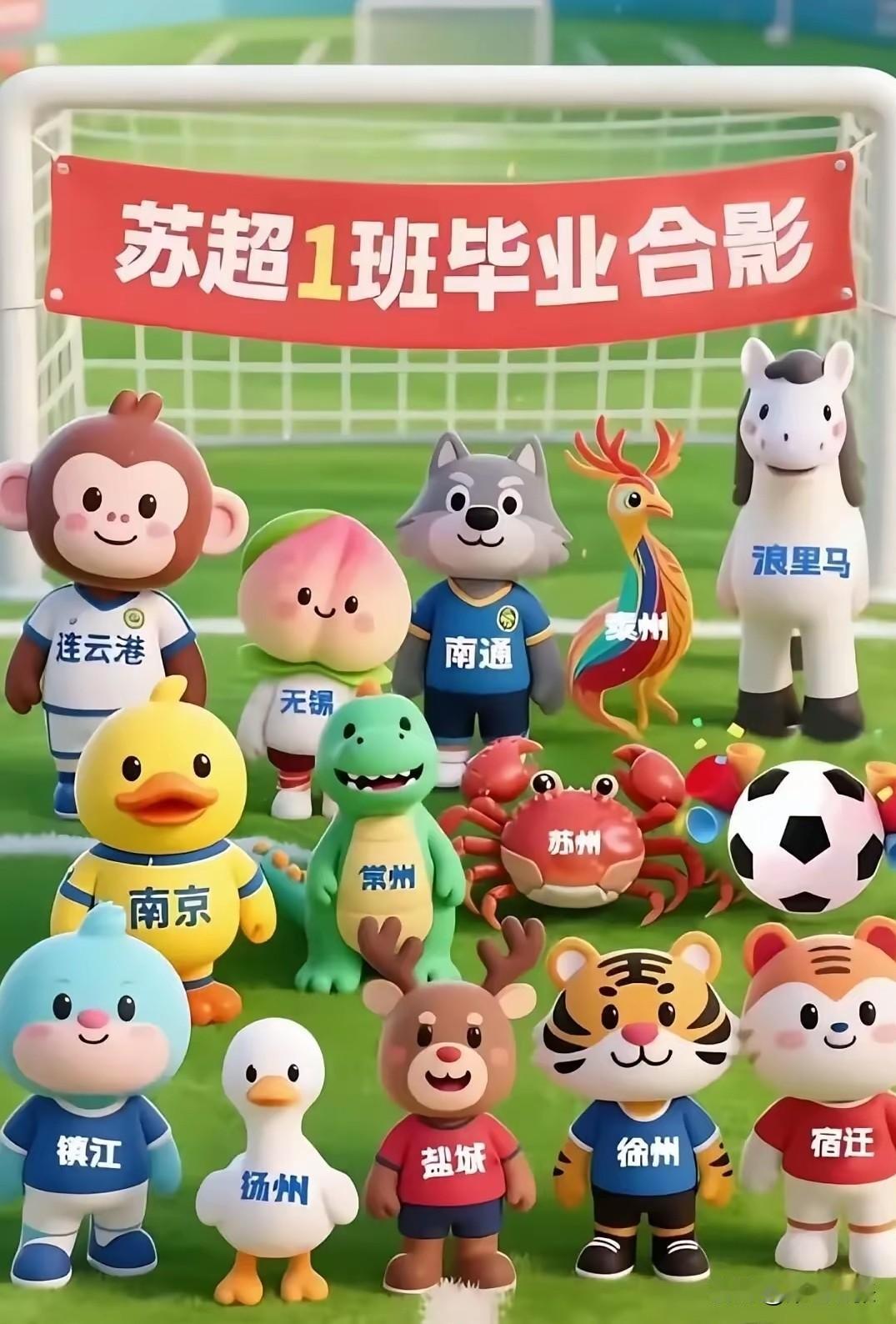 首届“苏超十三太保”毕业合影趣味十足!江苏省城市足球联赛让十三个设区市的队伍声名远扬,各城市都有独特代表形象。南京选鸭子,盐水鸭堪称一绝;连云港选猴子,其是花果山齐天大圣老家;苏州选螃蟹,阳澄湖大闸蟹闻名遐迩;常州选恐龙,恐龙乐园超酷。 南通选狼、淮安选马、徐州选虎,引人探究。或许南通有与狼相关传说或精神象征,淮安的马代表当地文化底蕴,徐州的虎彰显城市霸气。扬州选鹤,仙鹤自古是吉祥象征,与扬州风雅契合。镇江选豚,长江江豚为城市增添灵动气息。泰州选凤,寓意城市祥瑞升腾。宿迁选神(项羽),西楚霸王的英雄气是城市精神旗帜。 每个形象都承载当地特色与文化,借“苏超”舞台,能让更多人了解江苏各城市魅力。相信未来“苏超”会带来更多文化惊喜与碰撞。