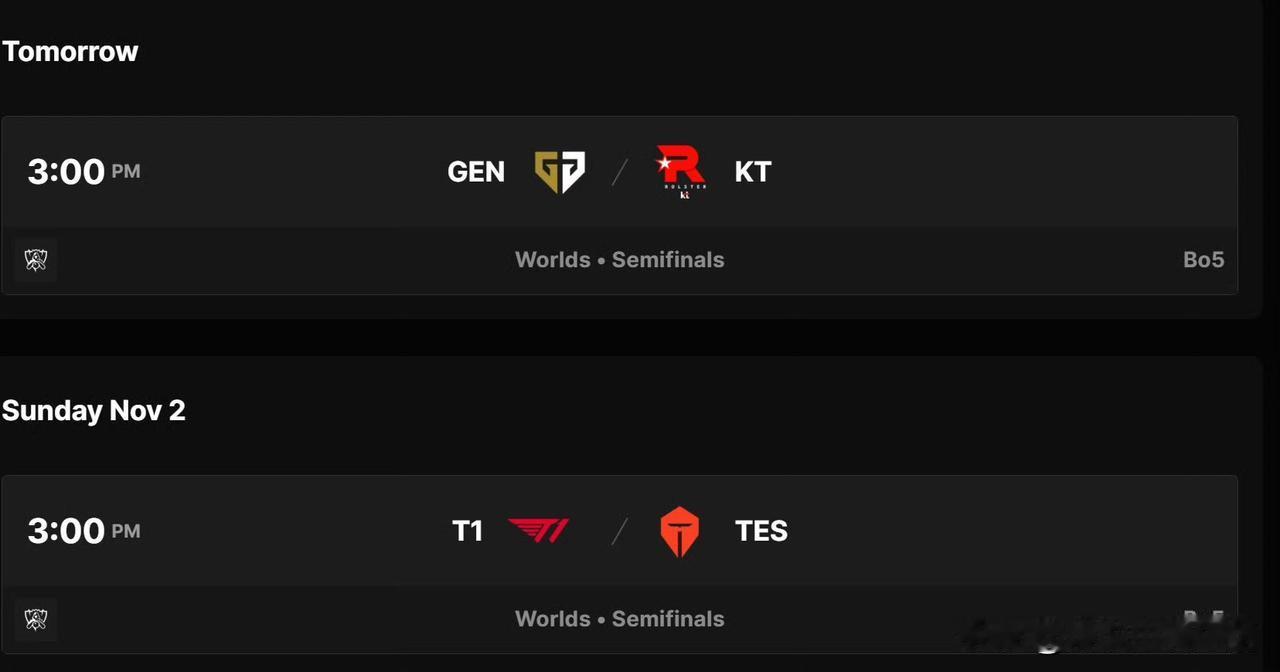 四强对阵出炉。 周六LCK内战,GEN对战KT; 周日T1对战TES; 都是下午3点开始。 感觉已经没指望了,给予希望最多的AL止步八强,被LCK四号种子T1 3:2带走,个人觉着TES更没赢的可能了…… 实话讲,AL真的打的已经很好了,多次上演奇迹团,但T1确实BP和游戏运营更好。 LPL队伍BO5没有能战胜T1的纪录要继续保持下去了……