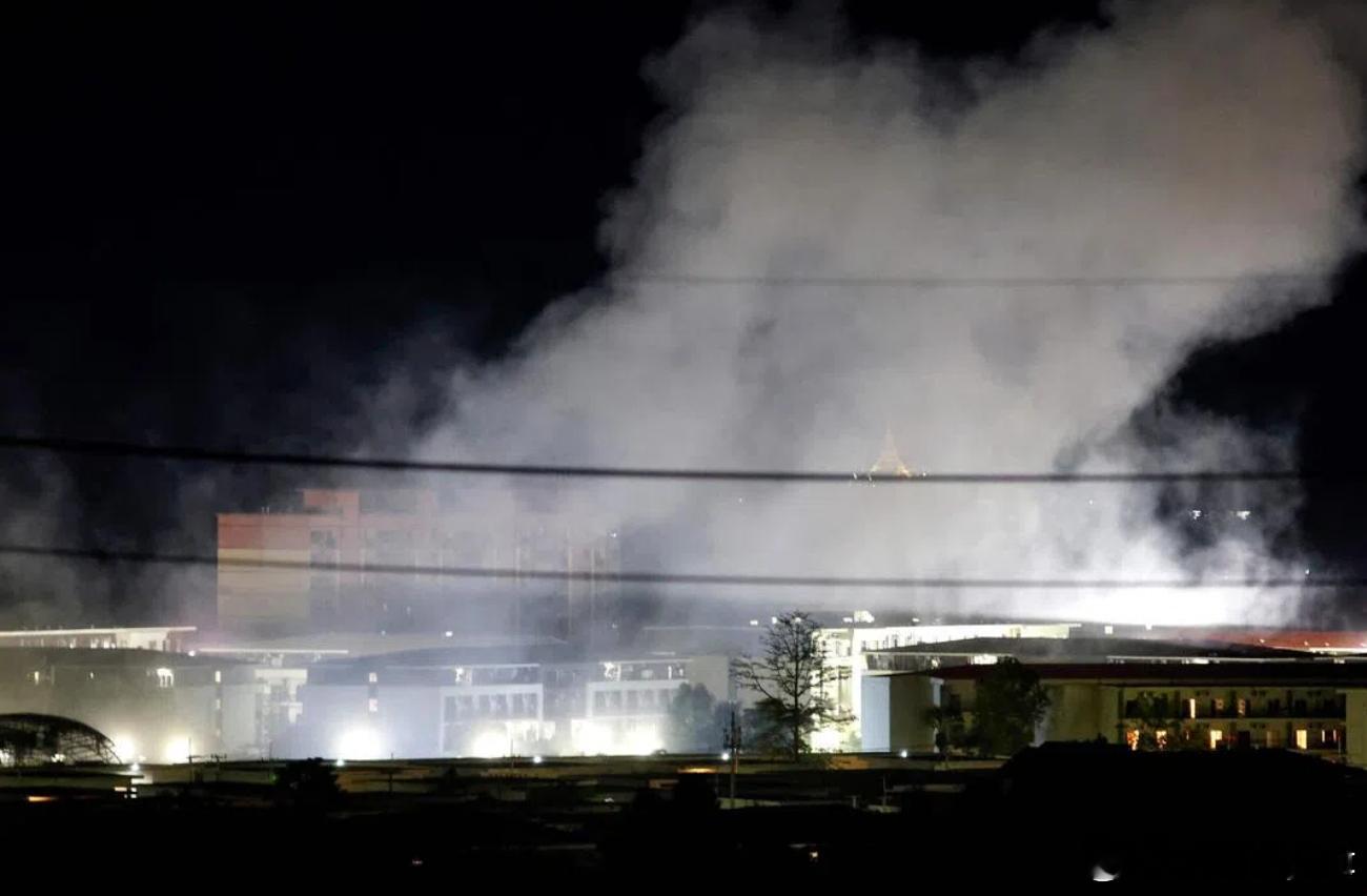 图:缅甸军方在近期的清剿行动中,连续数天对KK园区实施无人机空袭和爆破。图为10月24日夜间爆破后,园区大院冒起浓烟。 (法新社)