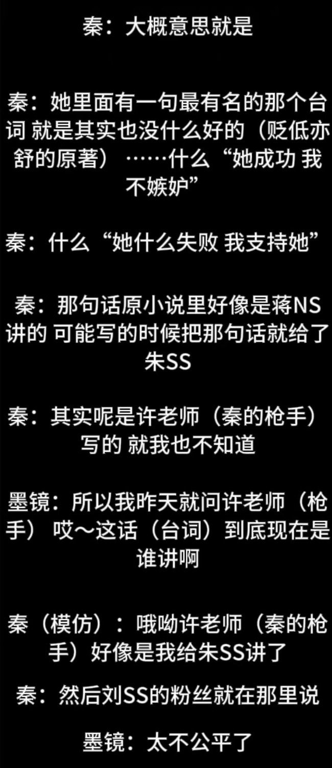 秦雯的枪手把《流金岁月》原刘诗诗的名台词给了倪妮,然后还因为服装路透差别。刘诗诗粉丝大闹工作室,刘诗诗找了秦雯,但被怼回去了。