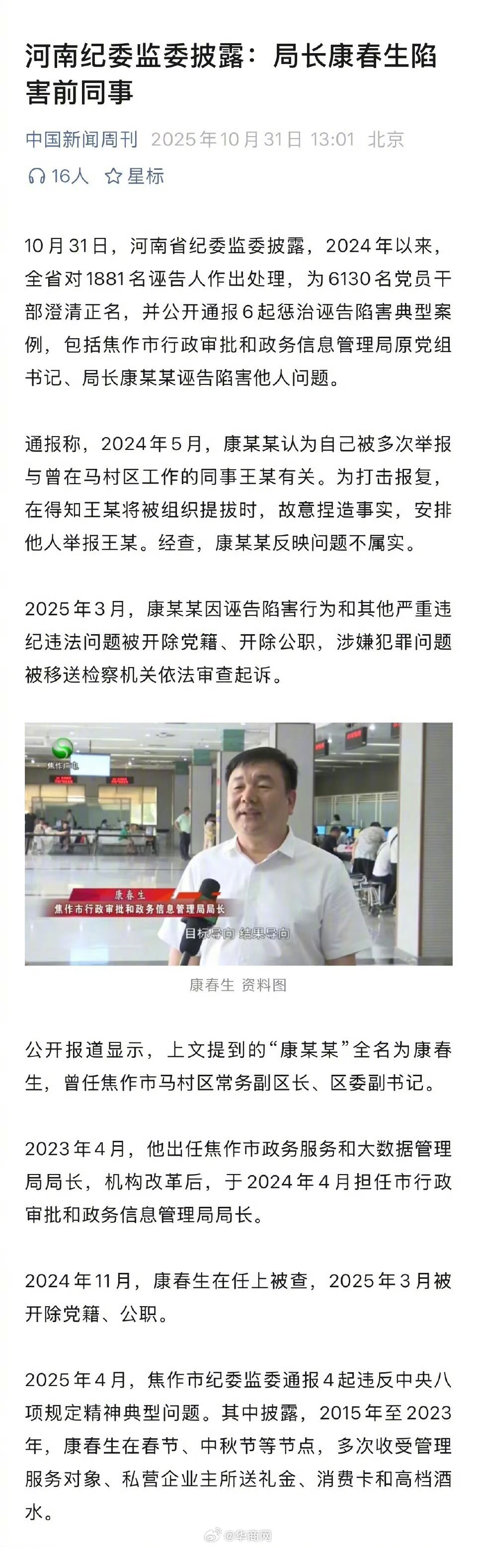 【#官员派人诬告陷害前同事阻其提拔#】#疑被前同事举报官员诬告报复阻其提拔# 10月31日,河南省纪委监委公开通报六起惩治诬告陷害典型案例,其中包括焦作市行政审批和政务信息管理局原党组书记、局长康某某诬告陷害他人问题。
