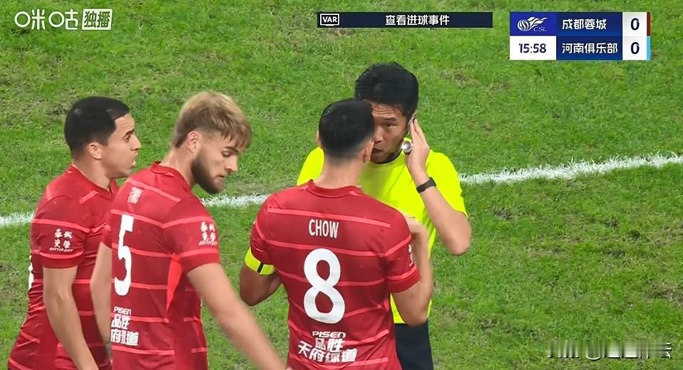 艾堃判罚再惹争议!成都蓉城1:2不敌河南建业,退出中超争冠行列! 今晚上这一场比赛火药味很浓,主裁判艾堃场上频频掏牌!场上的判罚引起了双方球员的不满!特别是在上半场的一次比赛中,成都蓉城队进球,艾堃判进球无效,因为是河南队有人手球,判给了成都蓉城一个任意球!这样的判罚令球迷们非常不满意,令成都蓉城的教练席不满意,比赛都是为了保证进攻有力,即便是对方犯规,如果进球也要有效,没想到艾堃竟然做出了这样的判罚,啼笑皆非!好在这个任意球,成都蓉城打进了!这是带着任务来的吗?