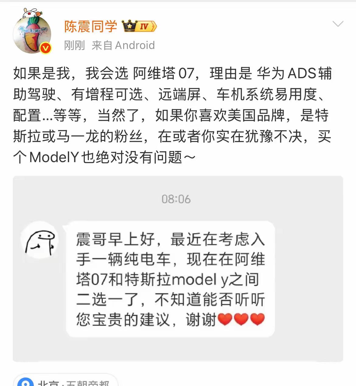 陈震的选择并不令人惊讶,尤其是在如今中国新能源汽车市场的迅猛发展背景下。阿维塔作为一款国产电动车,无论从技术配置,还是品牌定位,都已经突破了传统的国产车标签,逐渐在全球电动汽车市场中占据一席之地。说到这里,阿维塔07的华为ADS辅助驾驶系统的加入,简直就是锦上添花。 华为,这个曾经以通讯设备为主的科技巨头,近年来在智能驾驶领域的表现可以说是突飞猛进。陈震特别提到的辅助驾驶技术,给阿维塔07带来了实用且智能的驾驶体验。这种高效的驾驶辅助系统,可以让车主感受到类似于“智能伙伴”的存在,它不仅能在车主疲劳驾驶时提供帮助,甚至在复杂的交通环境中也能有效辅助判断。相比之下,虽然特斯拉的自动驾驶技术也占据着行业领先地位,但在中国市场,特斯拉的体验常常因为“环境适配”而受到不少用户诟病。例如,特斯拉的自动驾驶系统在国内特有的道路复杂性上偶尔会出现判断失误,特别是在高密度城市中,如何完美适应本土化的交通情况,仍是一个挑战。 阿维塔的优势不仅仅体现在智能化上,增程技术的加持也为其加分不少。增程版车型能够解决纯电动车最头疼的续航问题,尤其是对于那些长途驾驶的用户来说,增程技术可以有效避免“电量焦虑”。特斯拉Model Y虽然已经在续航和性能方面做得相当出色,但面对长途出行,阿维塔07的增程能力无疑是一个非常有吸引力的选择。 然而,正如陈震所言,如果你是一个死忠的特斯拉粉丝,尤其是崇拜马斯克以及特斯拉的品牌文化,那么选择Model Y也是可以理解的。特斯拉已经建立起了一个庞大的粉丝群体,这不仅仅是因为它的技术和产品本身,更因为它背后代表的科技创新和未来主义精神。对于很多消费者来说,特斯拉不仅是一辆车,更是一种身份的象征。在这种情形下,即便是面对阿维塔这样强大的竞争者,特斯拉依然拥有无可忽视的市场影响力。 但如果从一个更加理性、注重产品实际使用体验的角度来看,阿维塔无疑是在国内市场表现更为出色的选择。特别是对于那些希望“既要科技感,又要适应本土化需求”的消费者,阿维塔的高性价比、华为加持的智能技术以及增程选项都让它具备了极强的竞争力。相比之下,特斯拉Model Y虽然在品牌效应上占有优势,但它的高价格和某些使用上的局限性,可能会让一些消费者在理智与情感之间做出选择时,犹豫不决。 值得注意的是,随着政策对新能源汽车的扶持力度越来越大,消费者的购车选择标准也在发生变化。越来越多的消费者开始关注车辆的智能化、续航和实用性,而不仅仅停留在品牌和性能的表面。对于阿维塔来说,这一系列的市场趋势无疑是利好的。与此同时,随着国内汽车产业的崛起,中国品牌正在逐渐脱离“低价低质”的固有标签,越来越多的消费者开始看到国产电动车的高质量和高技术含量。 总的来说,阿维塔和特斯拉的选择,不仅是两个不同品牌的对比,更是两种文化和消费心理的碰撞。如果你是一个追求技术和性能的实用主义者,阿维塔阿维塔智驾 陈震选车 阿维塔07 07显然更能满足你的需求;而如果你是一个追求品牌效应,享受特斯拉的科技感和未来感,那么Model Y可能是你的理想之选。陈震试驾体验 陈震试驾 陈震车 阿维塔06 阿维塔用车感受 大家怎么看呢?你会选择阿维塔07,还是依旧坚持特斯拉Model Y?欢迎在评论区留言,分享你的看法。