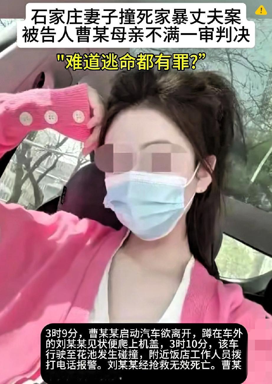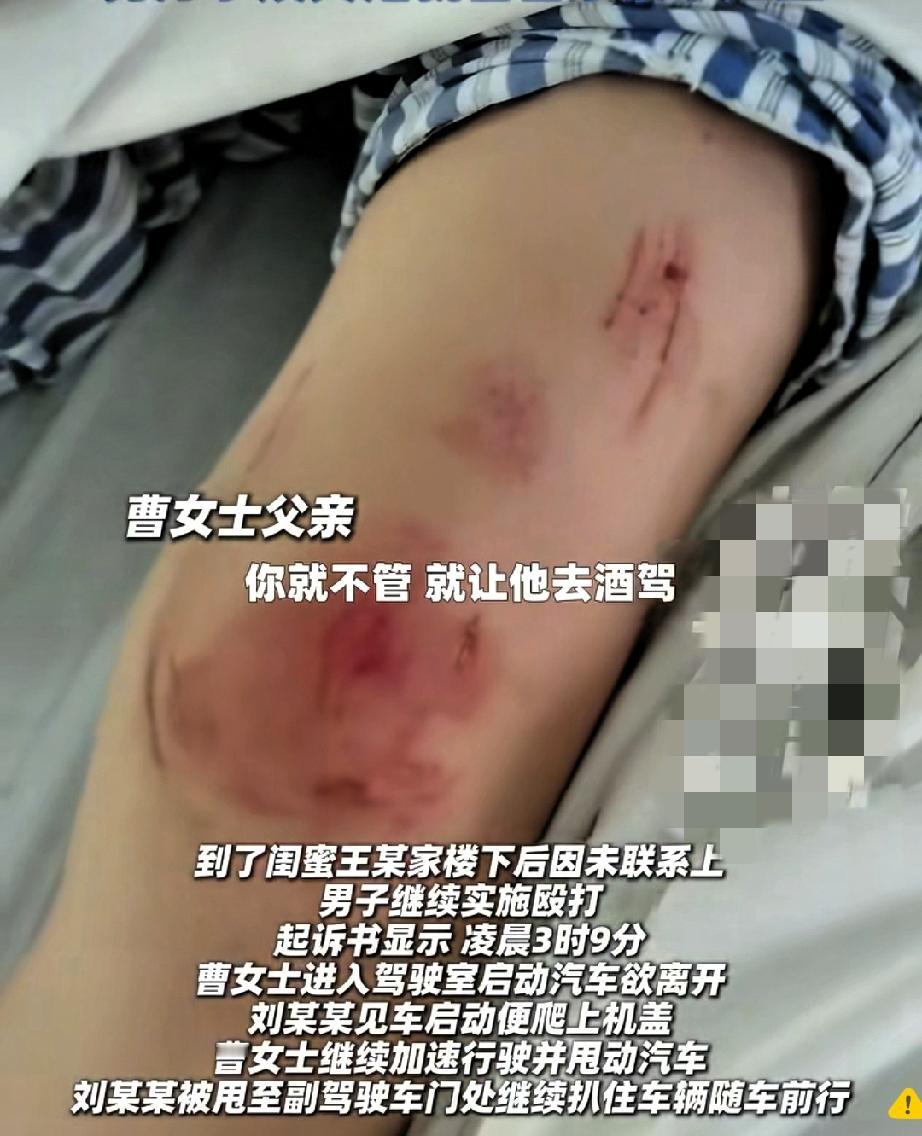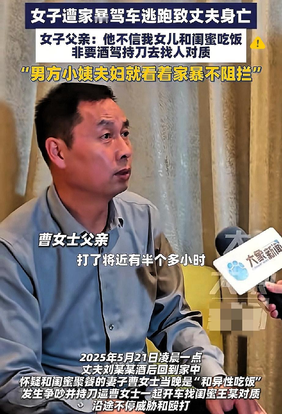 “他把我女儿拖到车后打,把下身衣服都扒光了……”曹某父亲哽咽的描述,听着就让人揪心! 就因为曹某和闺蜜吃了顿饭,丈夫误会她和异性见面,竟对她拳脚相向,还持刀逼她找闺蜜对质,一路没停手。 到了楼下闺蜜没接电话,殴打更变本加厉。 曹某被逼得驾车逃跑,丈夫爬引擎盖阻拦,结果出事故身亡。 一审曹某被判故意杀人十三年,现在她上诉了。 说实话,张玉霞律师说得太对了,曹某当时被打得伤痕累累,还遭羞辱,生命都受威胁,意识混乱下只想保命,开车根本没法冷静。 这哪里是故意杀人,明明是被逼到绝境的自保。 家暴从来不是私事,绝境中的反抗更该被公正看待。 你觉得曹某的量刑过重吗? 对于这种家暴反抗致对方死亡的情况,该怎么判才合理? 来评论区说说你的想法。