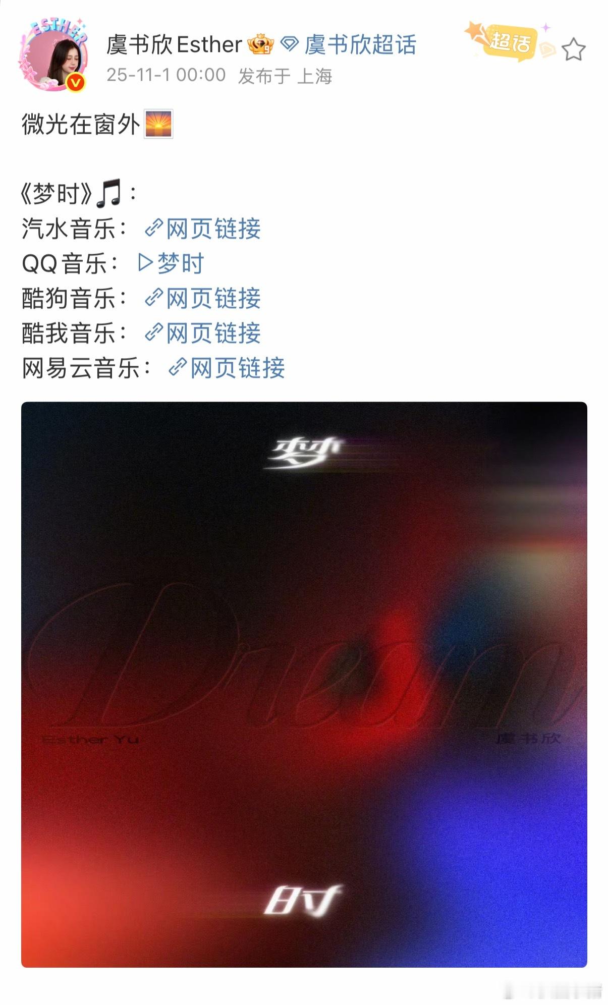 虞书欣出道9周年新歌《梦时》上线!一万➕人在听,有虞书欣来~