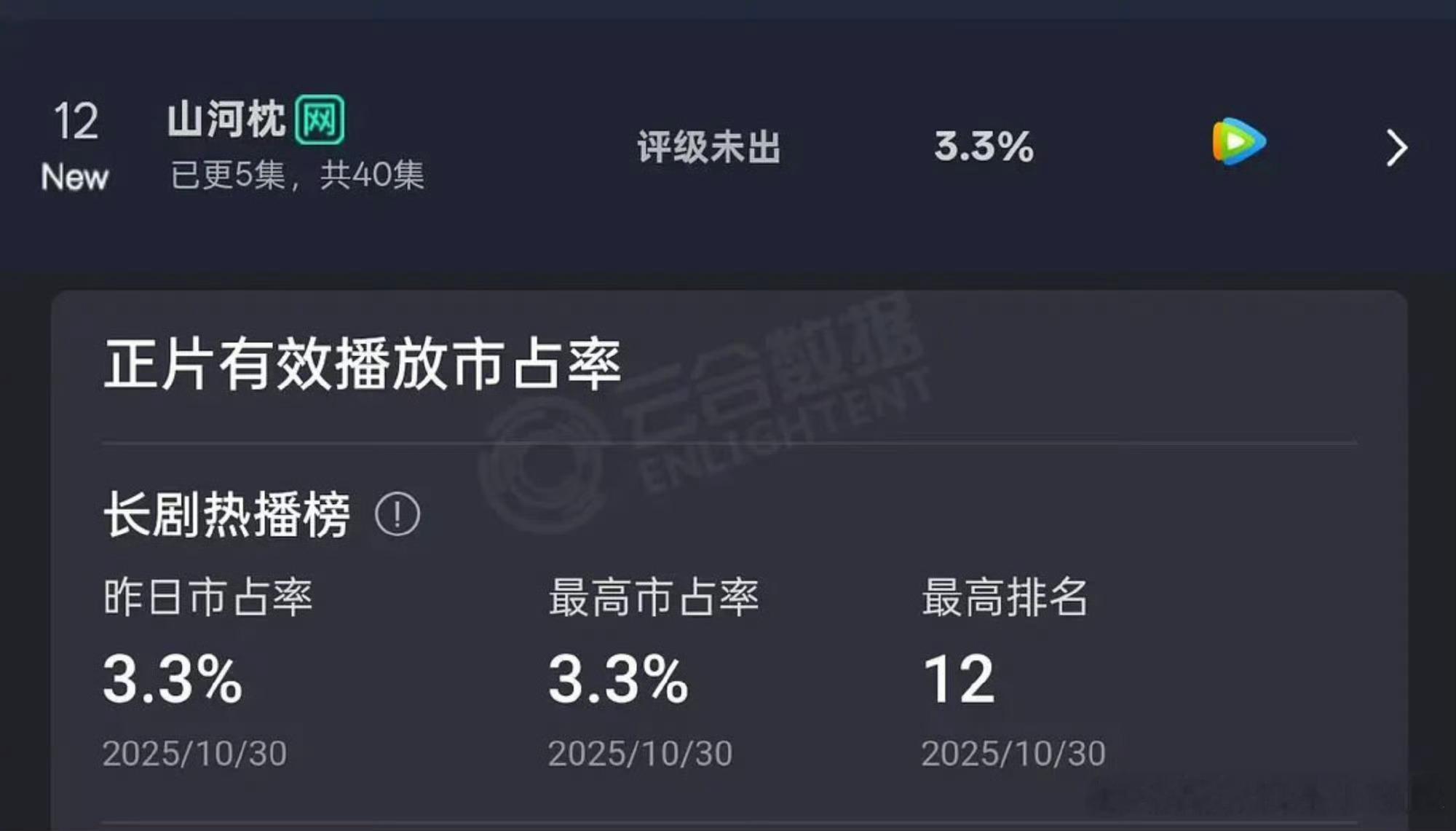 山河枕云合首日占比仅3.3,大趋势不太妙啊。想当初粉丝是奔着以黑马之姿赢暗河传,水龙吟和天地剑心的~