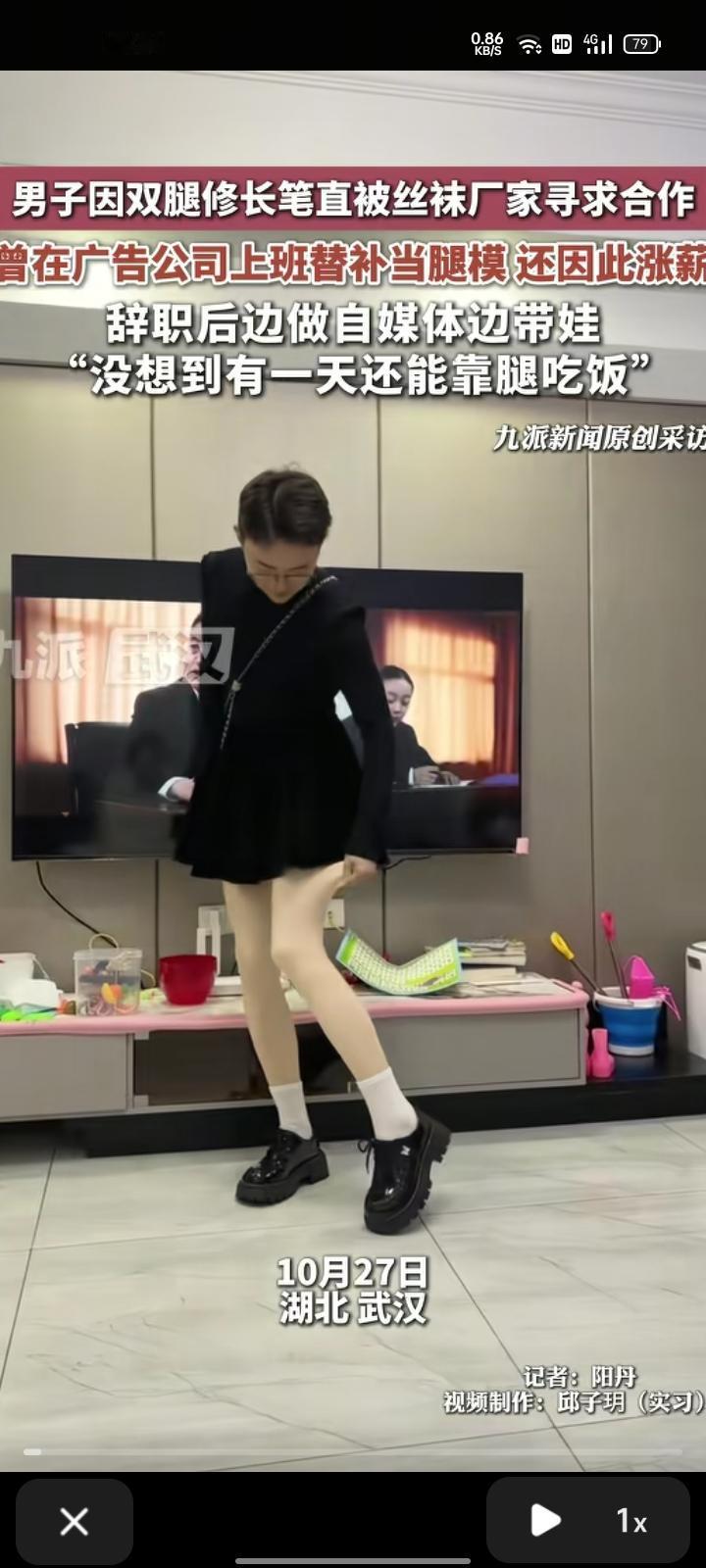10月27日,湖北武汉。31岁的徐先生腿型修长,堪比网红模特,丝袜商家求他合作,妻子也羡慕他的腿。徐先生经常和老婆说“没想到有一天还能靠腿吃饭”。 徐先生称,他身高177厘米,体重120斤,没有对腿部做过针对性训练,腿型可能是遗传自妈妈,没有开过特效,可能是拍摄角度问题。 他曾在广告公司从事3D设计,公司接了丝袜品牌的广告。为了降低拍摄的模特成本,老板就让他尝试一下,没想到他当腿模拍出来的效果特别好,甲方也没人看出来这是男生的腿。有女装找来,他坦言因身高较高,且上半身骨架与女性差别较大,很多款式并不适合。 “靠腿吃饭”确实让人大开眼界,但眼见不一定为实。不过话说回来,自媒体时代下,其实人人可以发挥出自己的优势,大家可能想听到或者看到一些不一样的东西、寻找一些同频的人,对你来说哪怕你不想做自媒体,你也可以拍摄记录当下最年轻的自己。