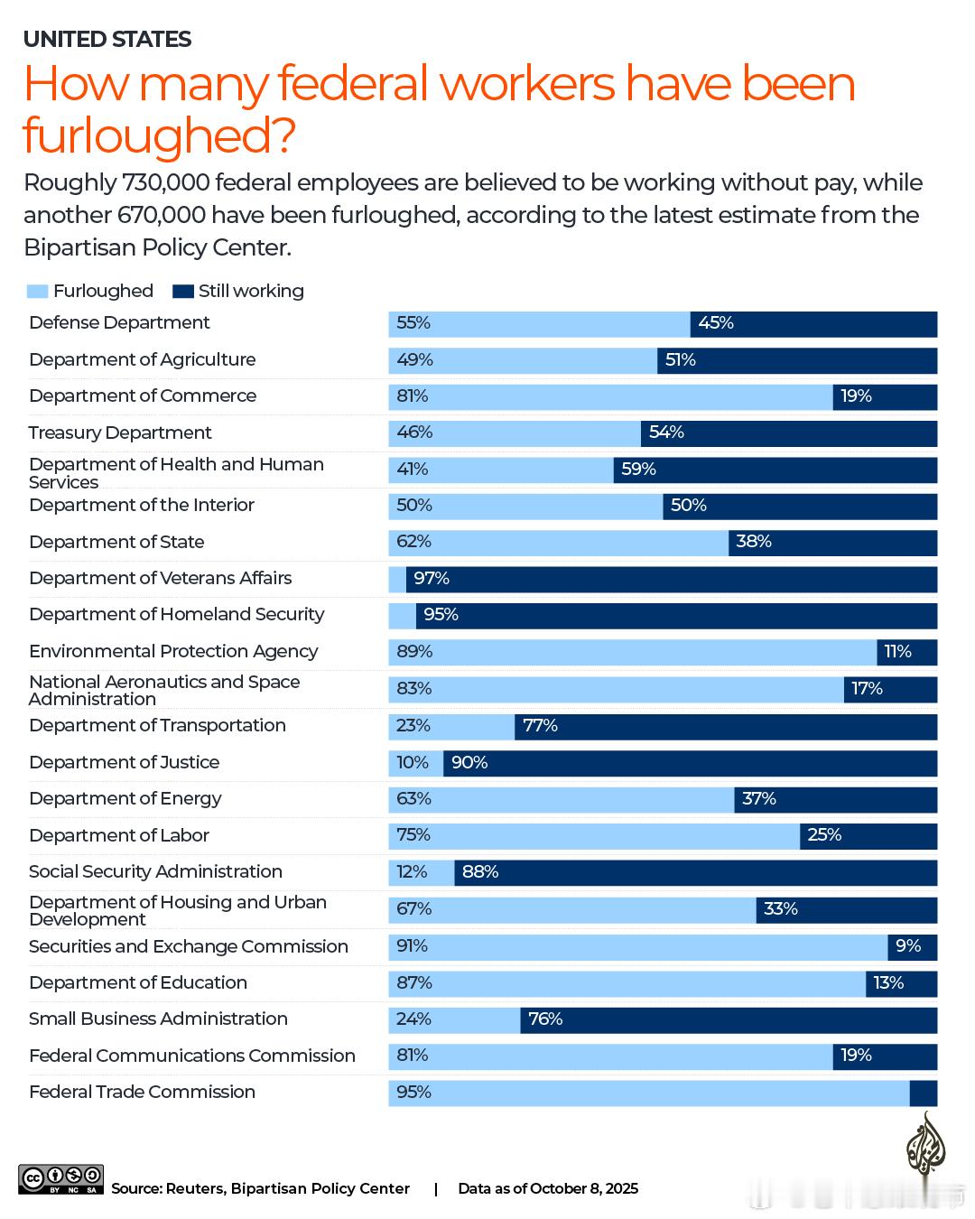 受冲击最重的部门:退伍军人事务部97%被休假,国土安全部95%,联邦贸易委员会95%,证监会91%,环保署89%,教育部87%,NASA 83%,商务部与联邦通信委员会均在八成以上。