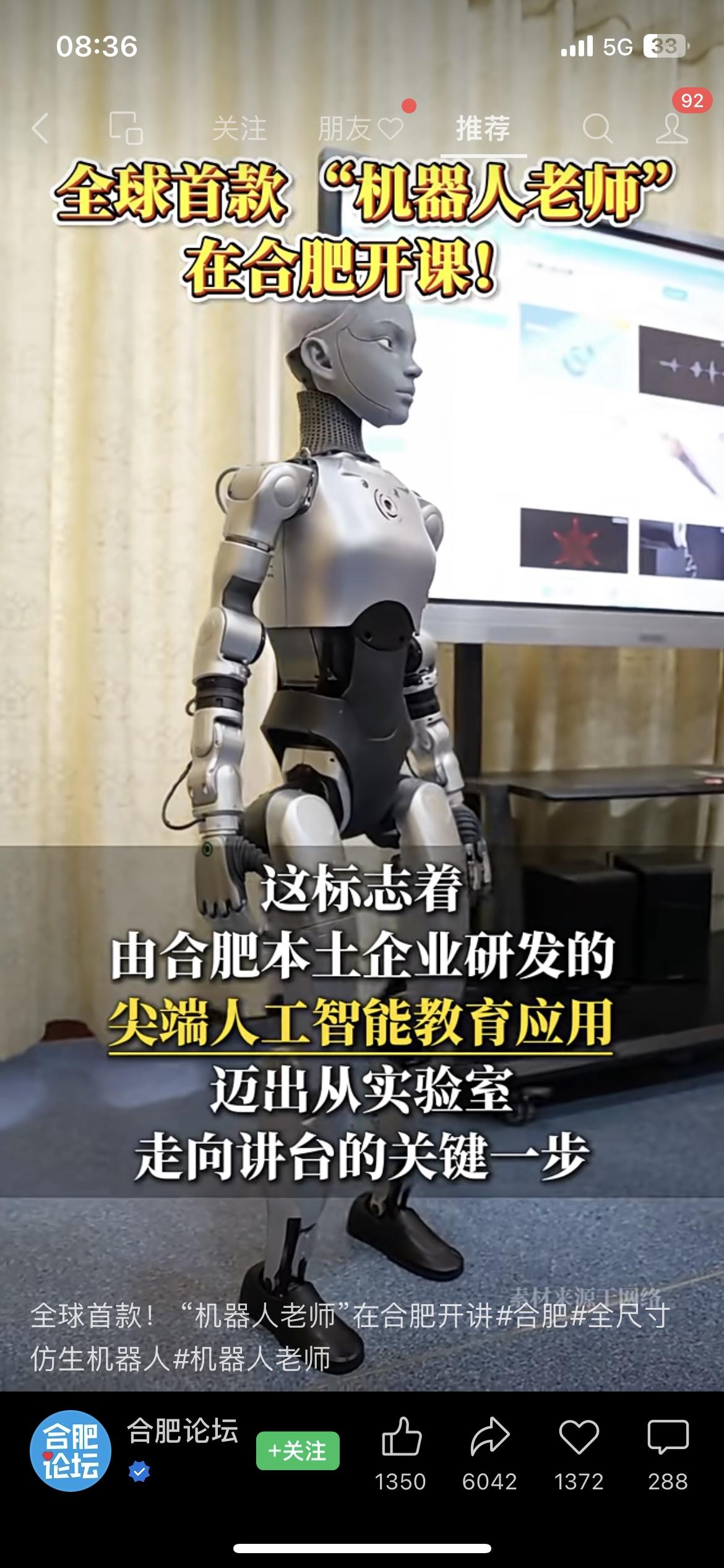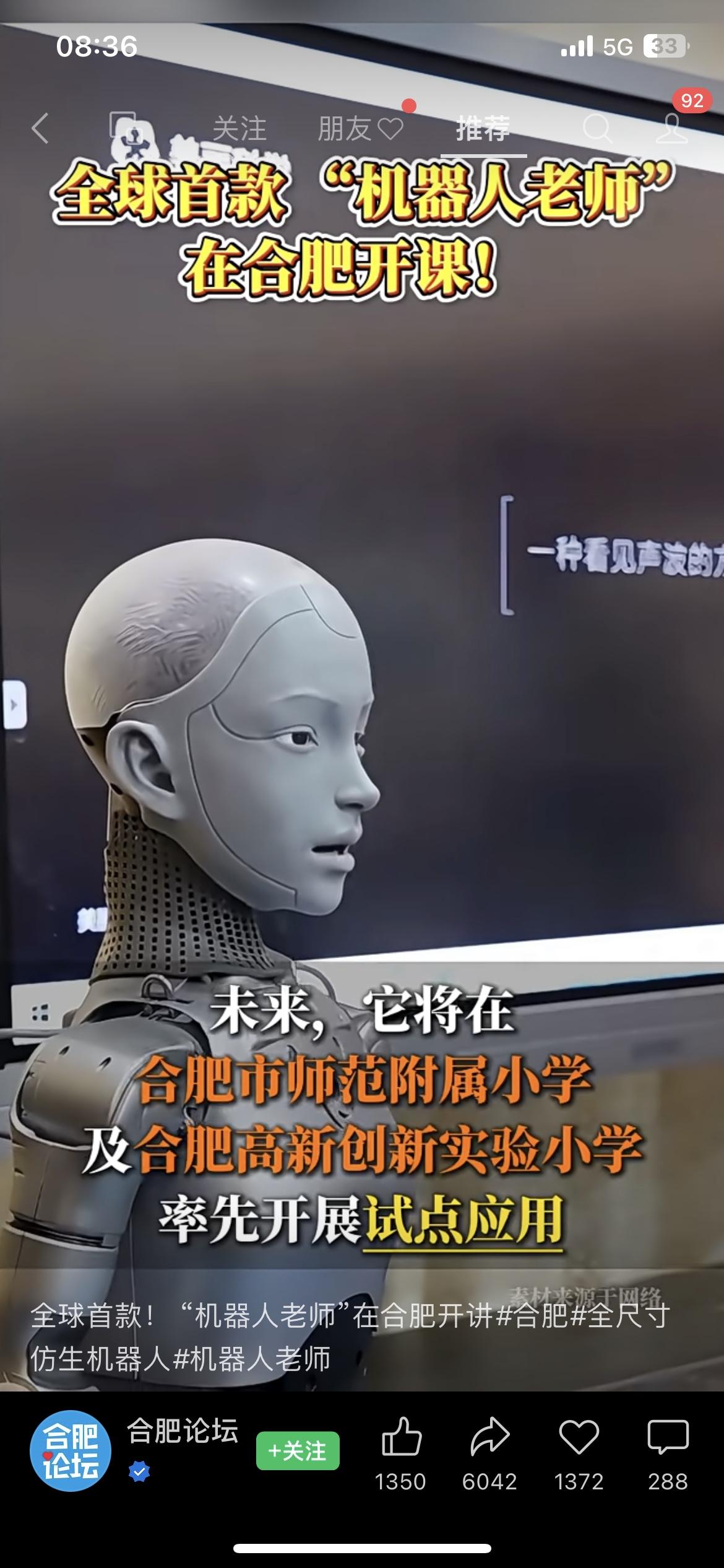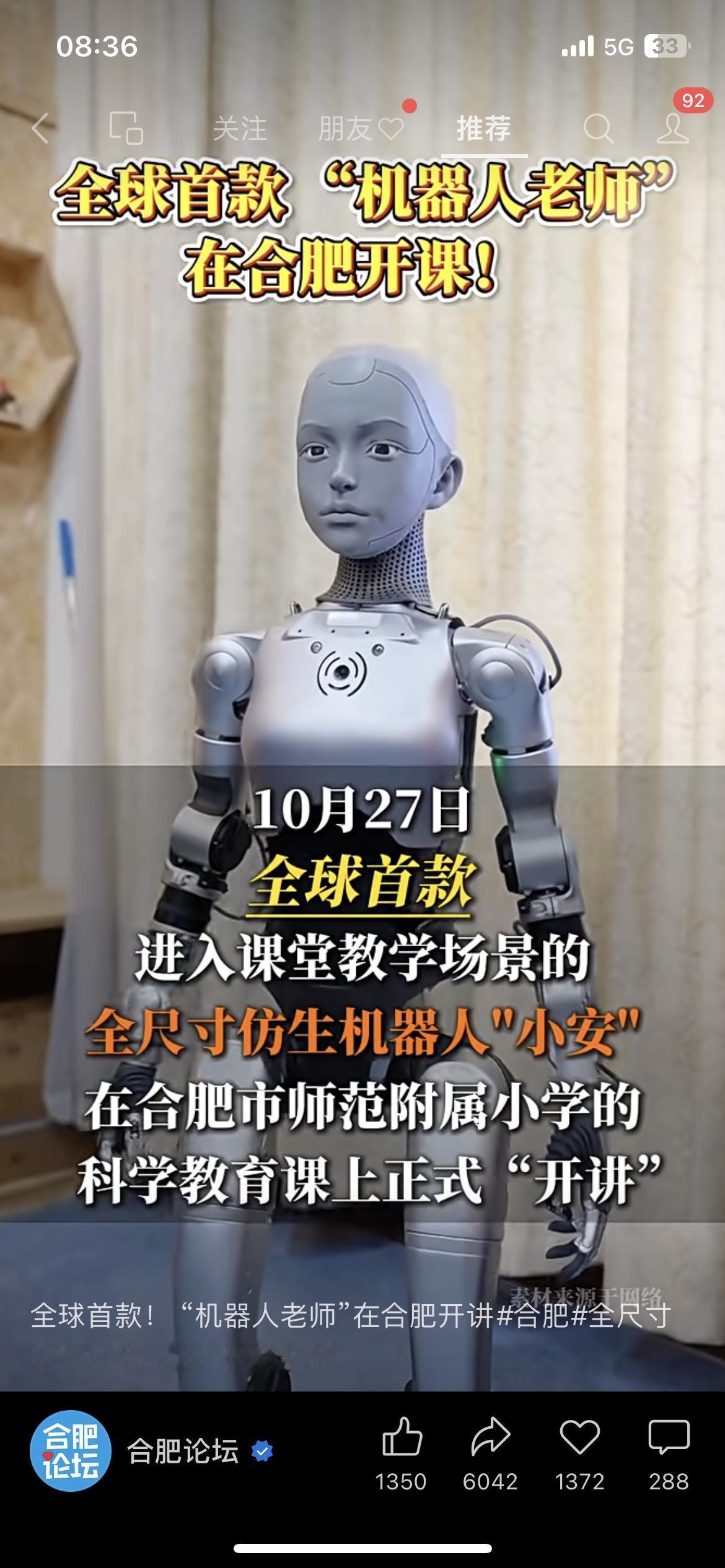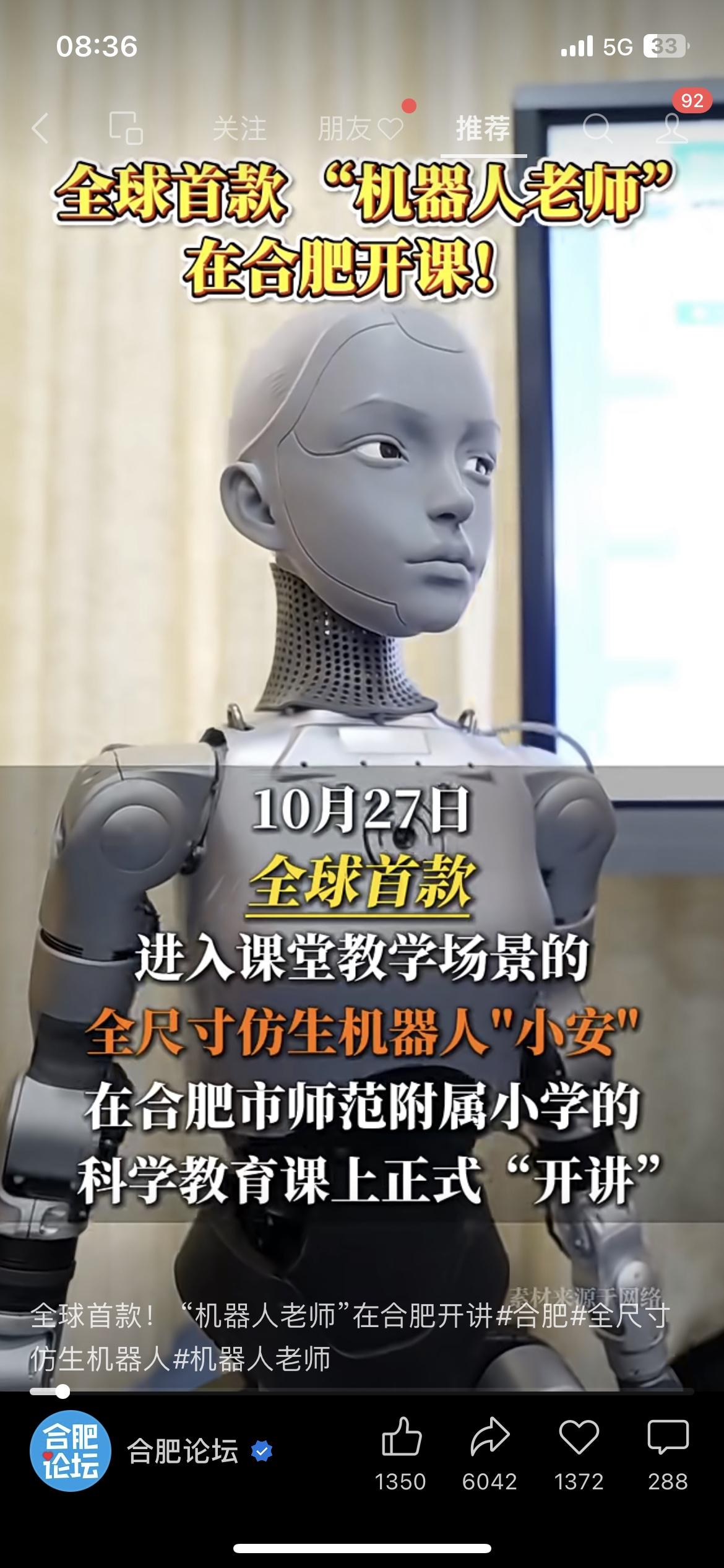 合肥炸了!机器人抢老师饭碗 合肥某小学刚搞了个大新闻:10月27日,全球首款机器人“小安”直接站上讲台教科学课,会提问、会互动,学生追着它问问题,旁边真人老师都看愣了。 以后老师真要失业?你敢让机器人教自家娃写作业吗? 家里有娃的快转:这科技是帮娃还是坑娃?