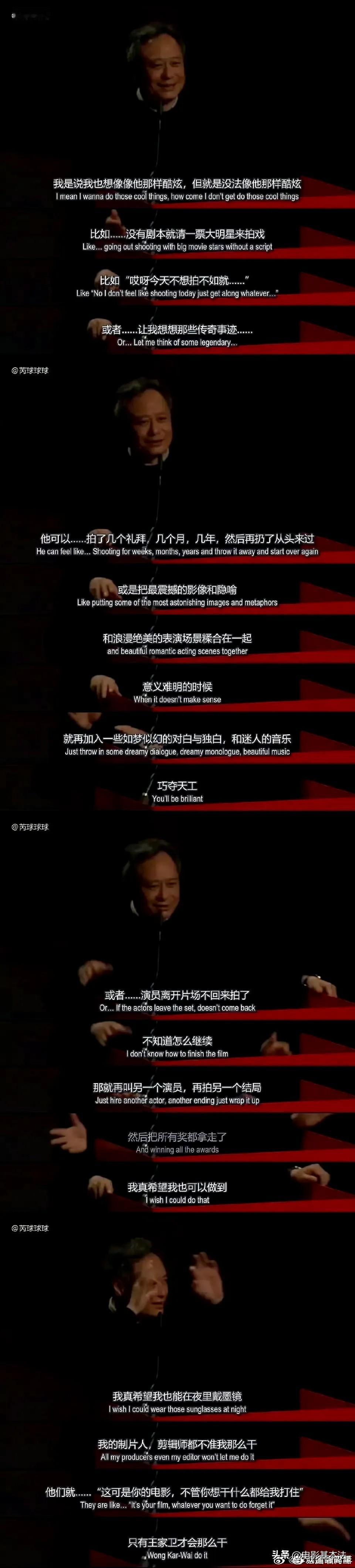 李安曾经说过很羡慕王家卫,觉得他很酷,于是买了墨镜准备也戴,但是制片人、剪辑师都坚决不允许他那么干,他们说只有王家卫才会那么干。 李安为什么羡慕王家卫?因为每次拍完电影总有很多记者采访他问他为什么那么拍,他又老实,每次都一五一十的解释,他觉得很累,然后他发现有个导演每次遇到这种问题都戴墨镜“装死”不回答,让记者自己去猜,这样很轻松。 老实的李安发现“原来还可以这么干”,顿时“惊为天人”,于是很羡慕,不想那么累就也想戴墨镜,可惜李安还是太老实了,制片人反对他就又放弃了。