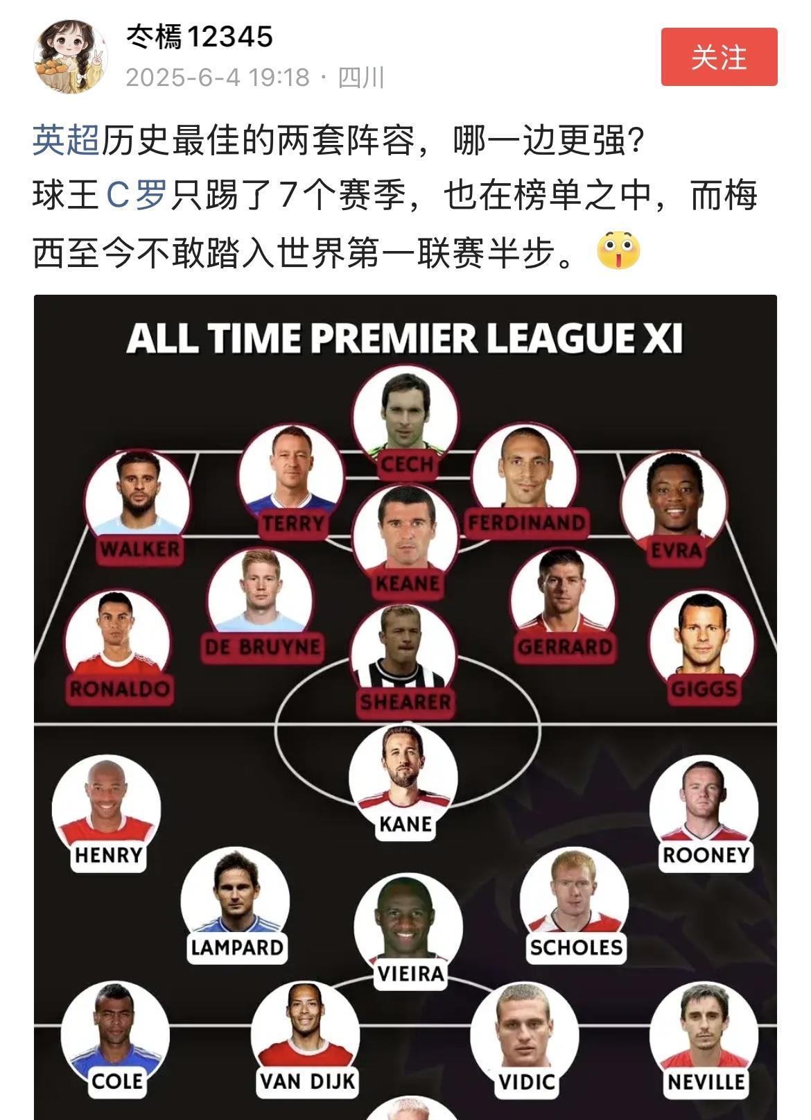 足球史排名第十一的C罗,其粉丝怒斥足球史前十巨星梅西、贝利、马拉多纳、克鲁伊夫、贝肯鲍尔、齐达内、斯蒂法诺、普拉蒂尼,盖德·穆勒、罗纳尔多,指责他们“是体系球员,严重依赖体系,且身体素质弱,对抗差,就是温室里的花朵,不适应世界第一联赛英超的快节奏高对抗,不敢踏入世界第一联赛英超半步,没有在世界第一联赛英超证明过自己”。