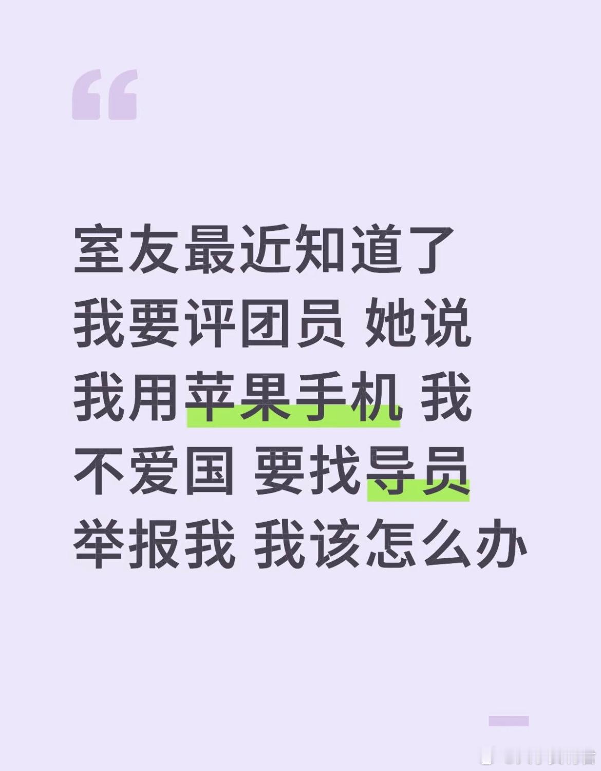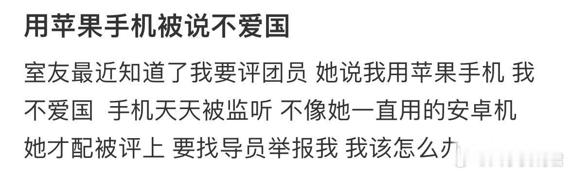 室友最近知道了我要评团员 她说我用苹果手机 我不爱国 手机天天被监听 不像她一直用的安卓机 她才配被评上 要找导员举报我 我该怎么办[哆啦A梦害怕]