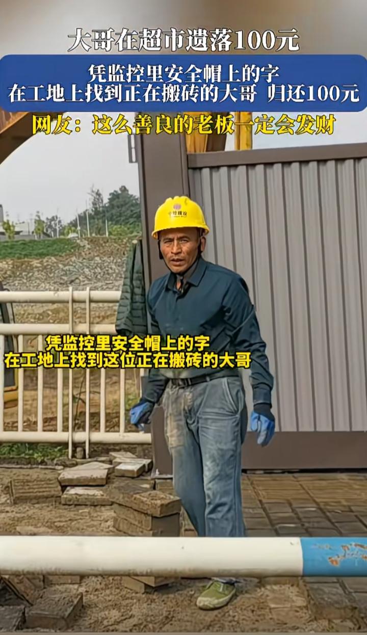 这样的老板该他生意兴隆发大财 农民工大哥在超市遗落100元的现金,老板通过监控看到安全帽上的字,找到大哥干活的工地,在确认后把钱还给了大哥 大部分人捡到东西后会等失主来找,甚至有些人会直接据为己有。有可能大哥自己都不知道钱丢在哪了,老板选择了主动,看完监控后去工地找大哥。老板能体谅大哥,知道他靠体力干活赚钱不易,这是他真正的血汗钱,这一百块可是他几天的饭钱。 给这老板点赞,积善之家,必有余庆 图片源自网络