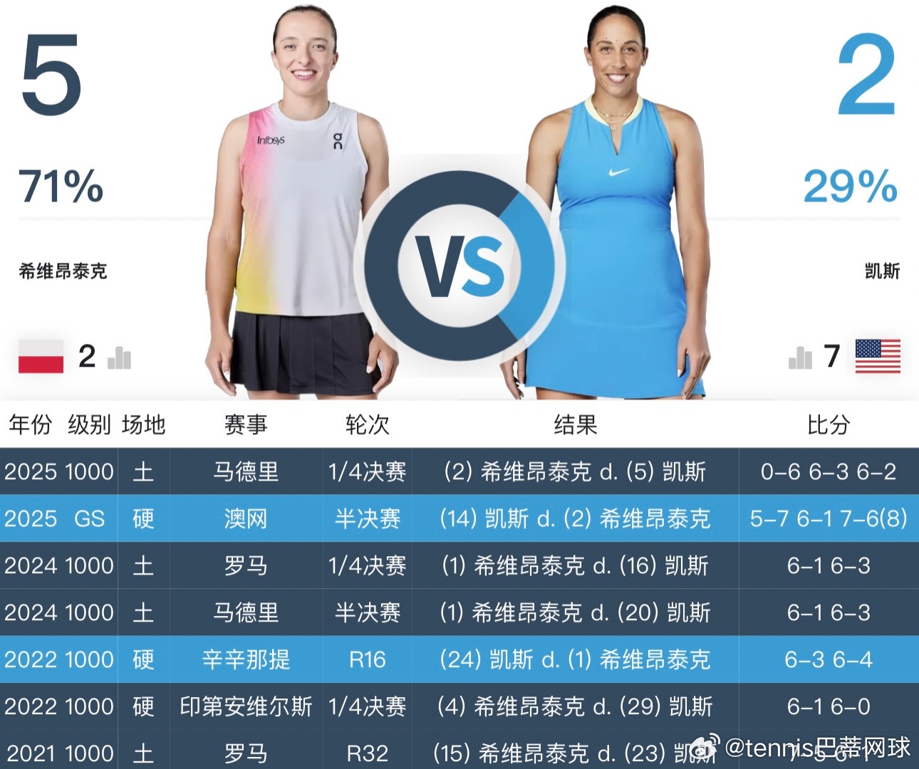 斯瓦泰克和凯斯交锋记录是5:2,今年各胜一次,但是凯斯在澳网半决赛的胜利,帮她圆梦了大满贯;凯斯跳过了整个亚洲赛季,她的手感如何,有待观察👀;