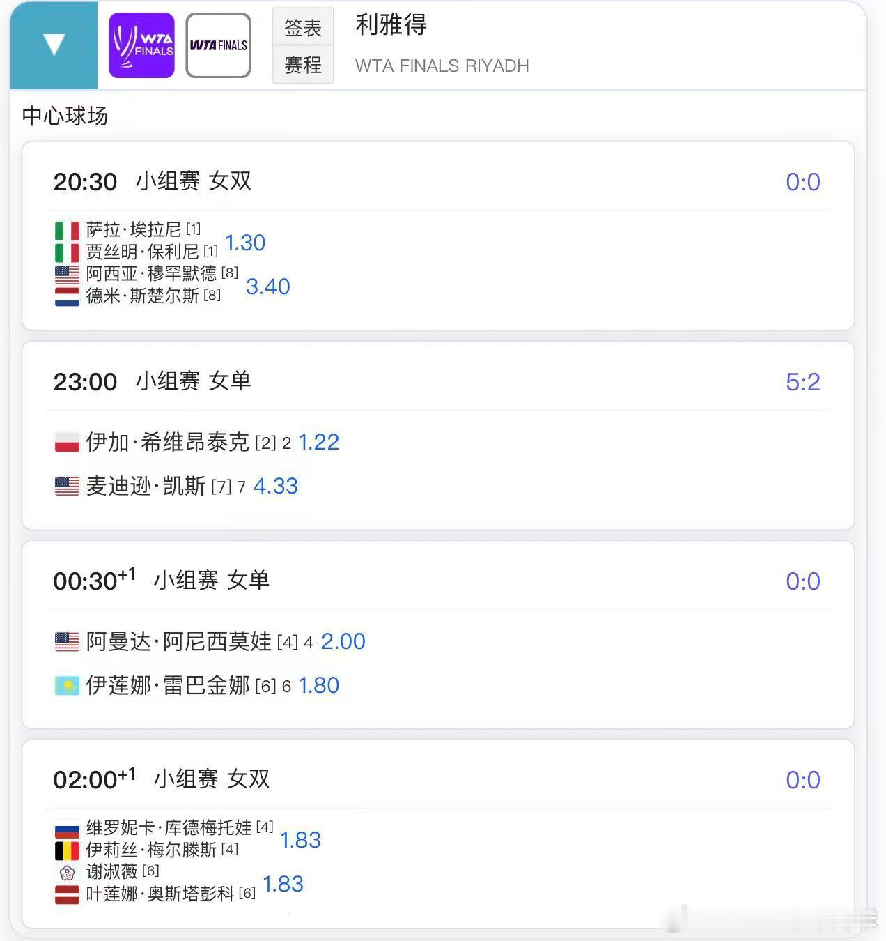 利雅得WTA年终总决赛今日开战!塞雷娜.威廉姆斯组23点斯瓦泰克vs凯斯随后莱巴