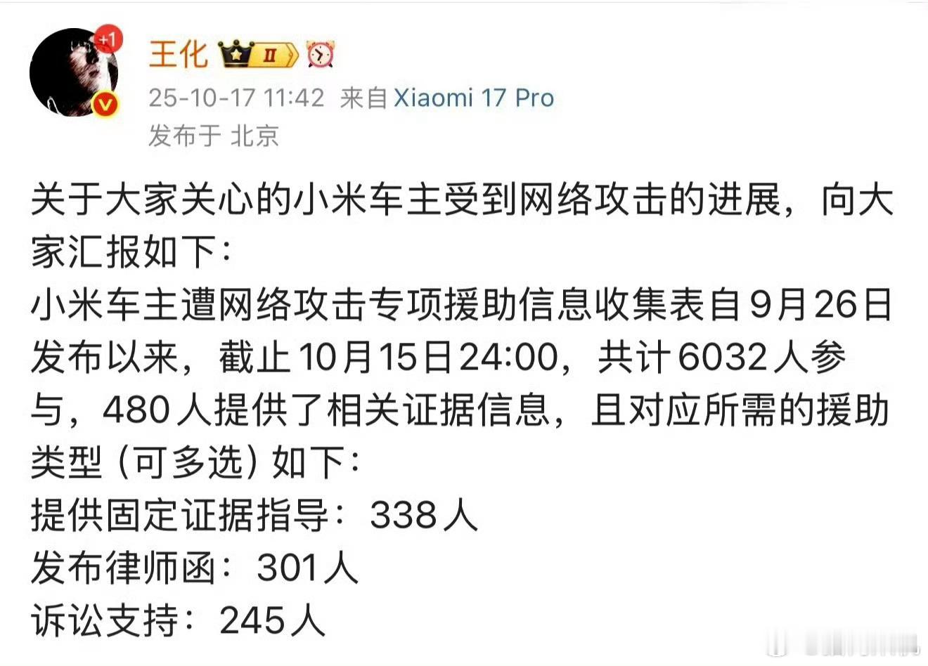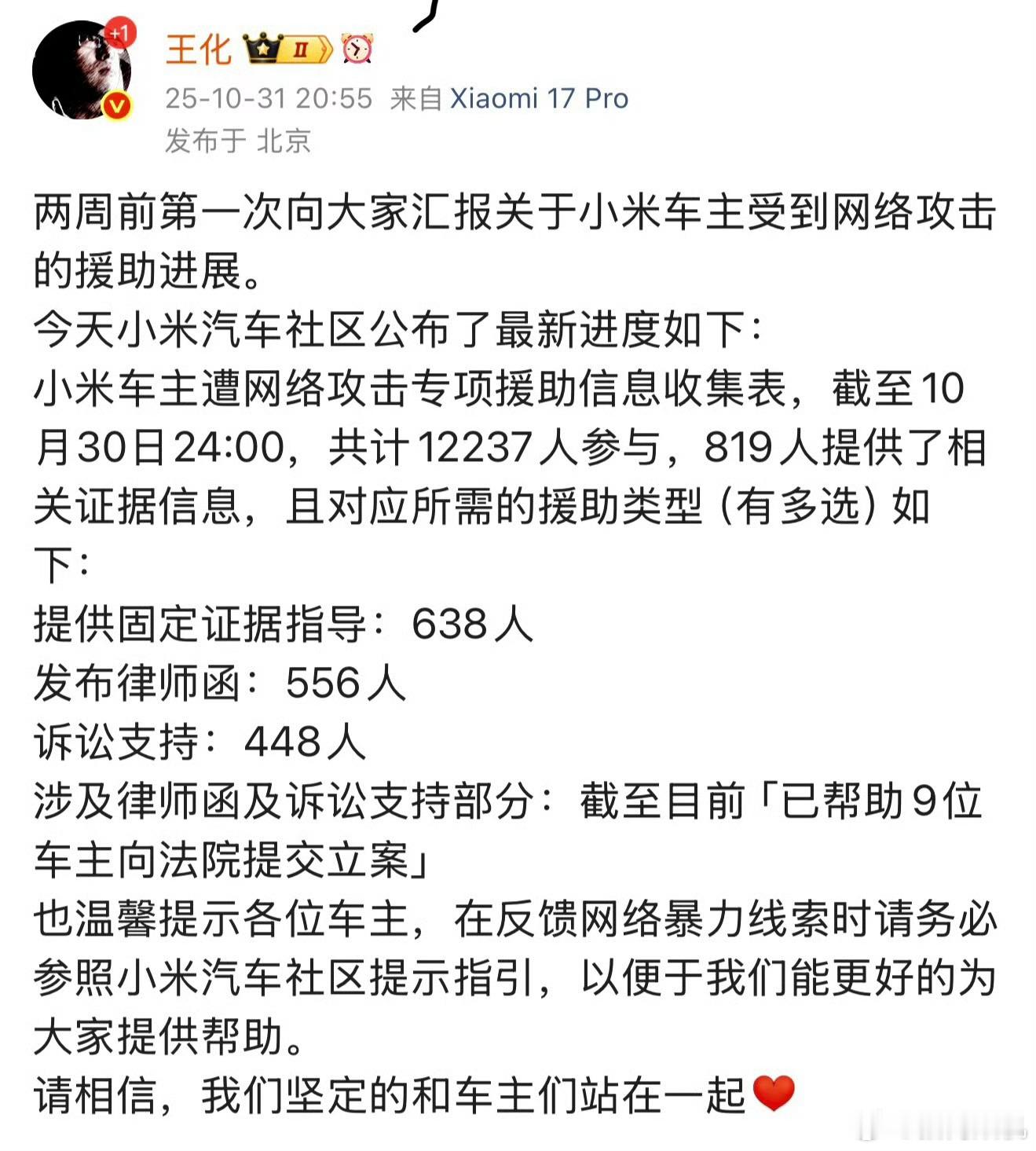 小米帮车主维权的进度,12337人参与,819人提供证据。其中,已经诉讼支持448人了。
