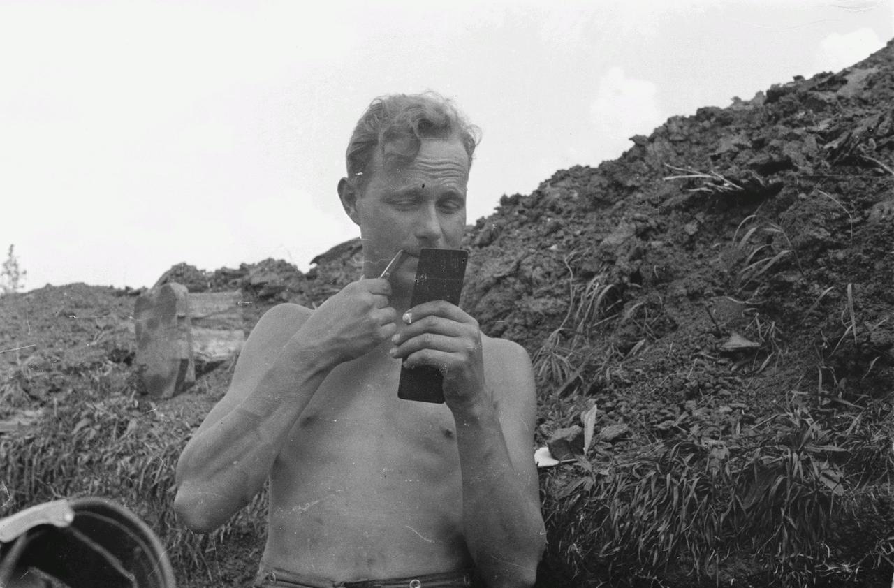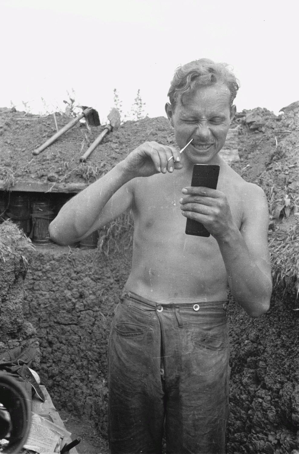 一个普通德军士兵最后的影像——1943年,东线,库尔斯克州,德军士兵弗朗茨·格拉瑟在战壕中修剪胡子。据推测,这张照片拍摄于1943年春夏的库尔斯克战役前夕。 弗朗茨·格拉瑟战前是一名在慕尼黑工作的专业摄影师,在苏联战场期间拍摄了大量风景与人物照片。当时他服役于第167步兵师,在“堡垒行动”期间该师配属给党卫军“帝国”装甲掷弹兵师。 1944年8月,他在雅西-基什尼奥夫战役中被俘,后在新罗西斯克附近的战俘营中去世,时年33岁。 “堡垒行动”是德军1943年7月在库尔斯克地区发起的战略进攻代号,是史上规模装甲会战,苏军称“库尔斯克战役”。 “帝国师”(2. SS-Panzergrenadier-Division “Das Reich”,徽标参见图3)是党卫军精锐装甲师,参与过法兰西战役、莫斯科战役,在库尔斯克前线承担南方集团军群主攻任务。 “雅西-基什尼奥夫战役”是苏军1944年8月实施的战略性进攻,十天歼灭德军22个师,促使罗马尼亚和保加利亚退出轴心国。