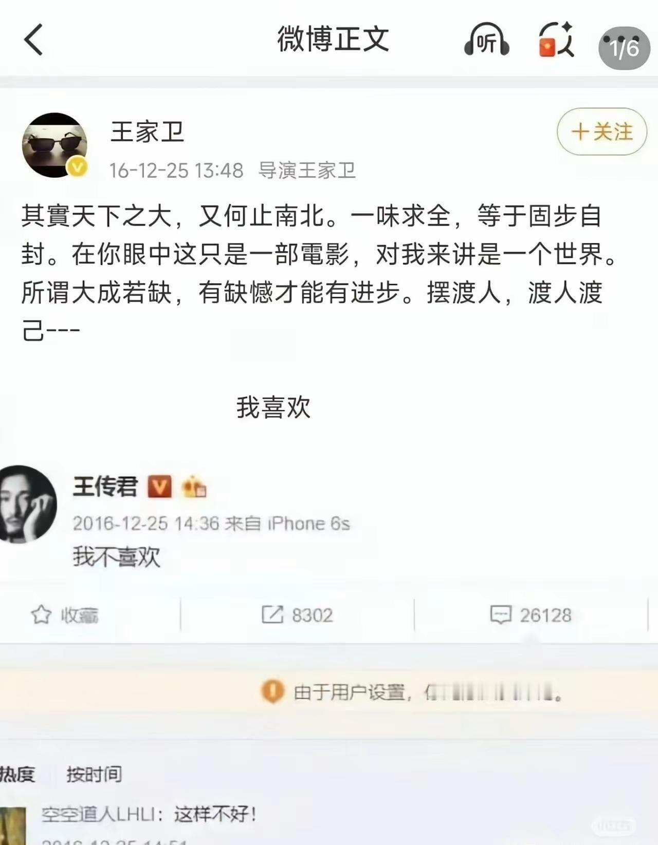 现在看,王传君才是人间清醒, 当初因为评价王家卫的电影, 说出来我不喜欢四个字, 结果被王家卫喷成了筛子, 以前觉得王传君情商低, 现在才觉得他是真性情, 王家卫这人,你尊重他没用, 不信你看唐嫣, 对他一口一个老师, 结果在他眼里,人家是装, 这下估计唐嫣对他彻底无语了,