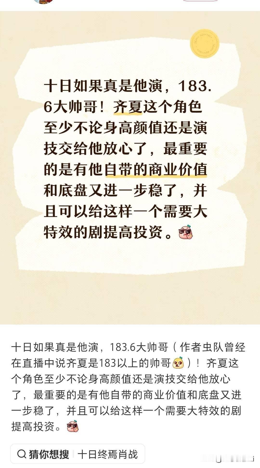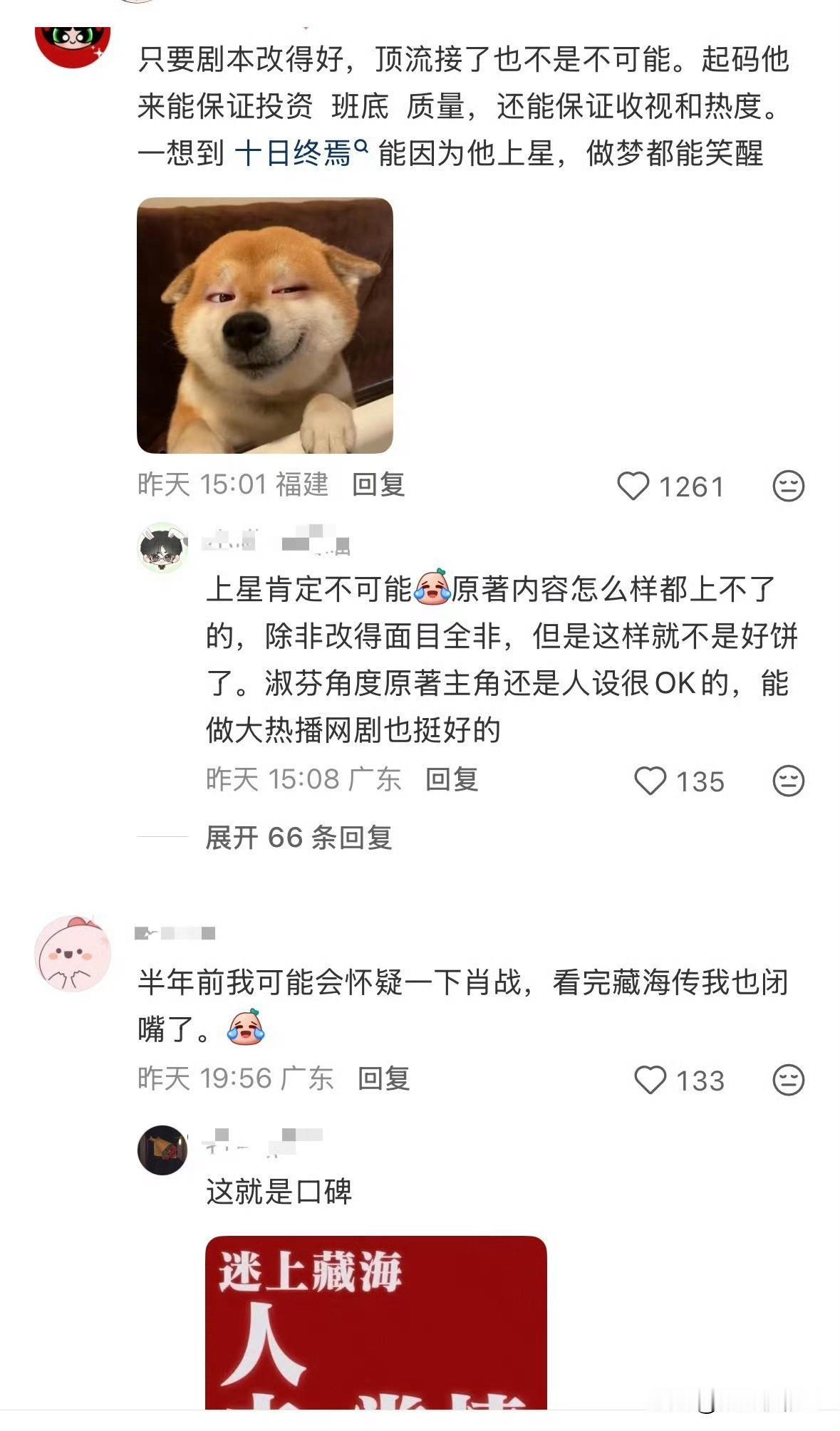 🍪带着肖战上了三天热搜,书粉欢天喜地,因为知道这种大热IP不可避免影视化,既然要做,就一定要找最顶级的演员吧,投资演技外形班底都会顶级,这可能是所有书粉的梦想吧。 不过肖战业内外口碑是真的太好了,业内默认所有的大男主剧本都先经过肖战挑选。网友观众认为一个大IP只有肖战来才能撑得起场面,剧才能做出想要的顶级效果。趁着这么多人讨论,大家去评论区多推荐藏海,看完更会对肖战欲罢不能