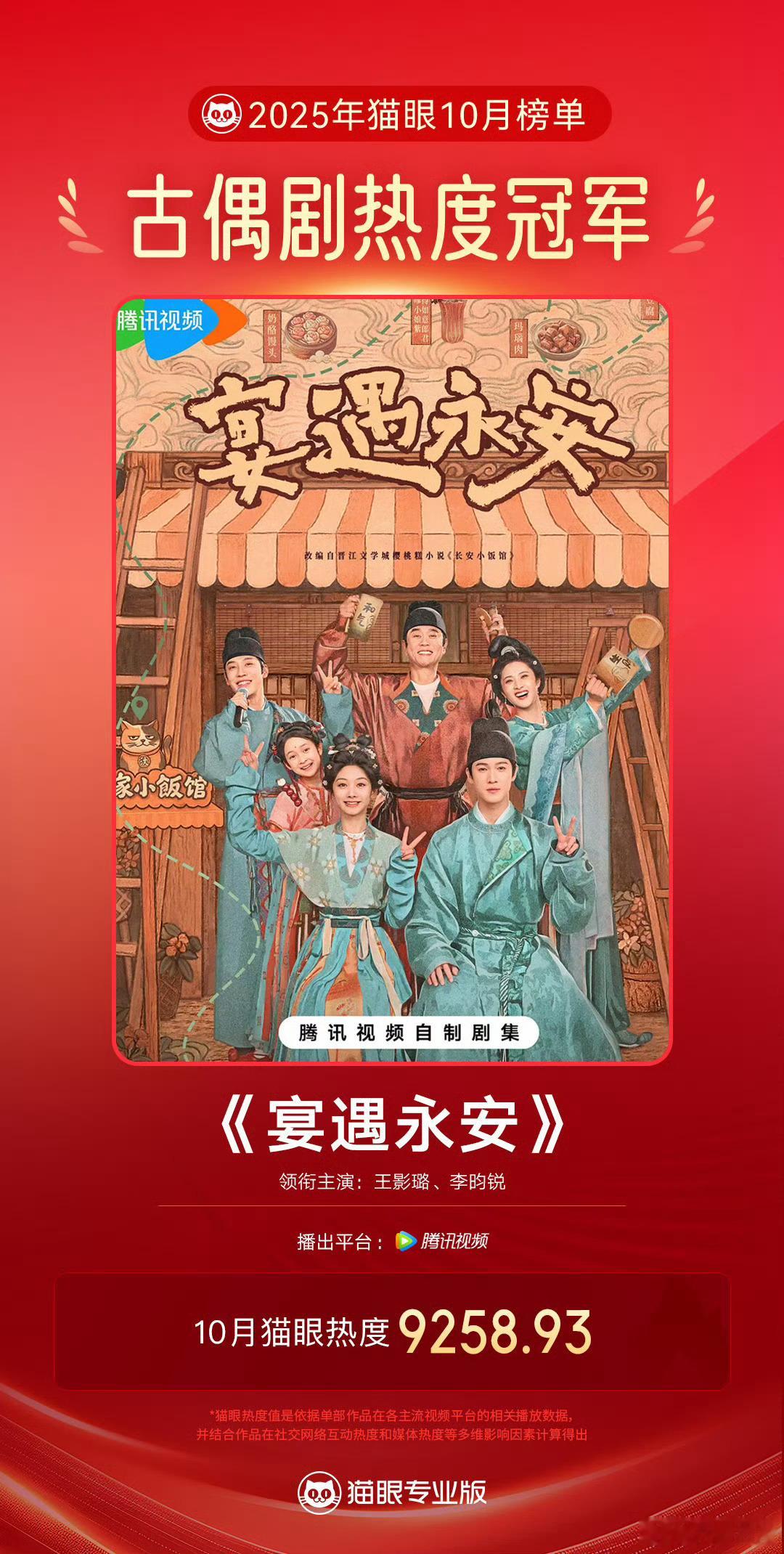 猫眼10月古偶剧热度榜冠军 王影璐、李昀锐 《宴遇永安》