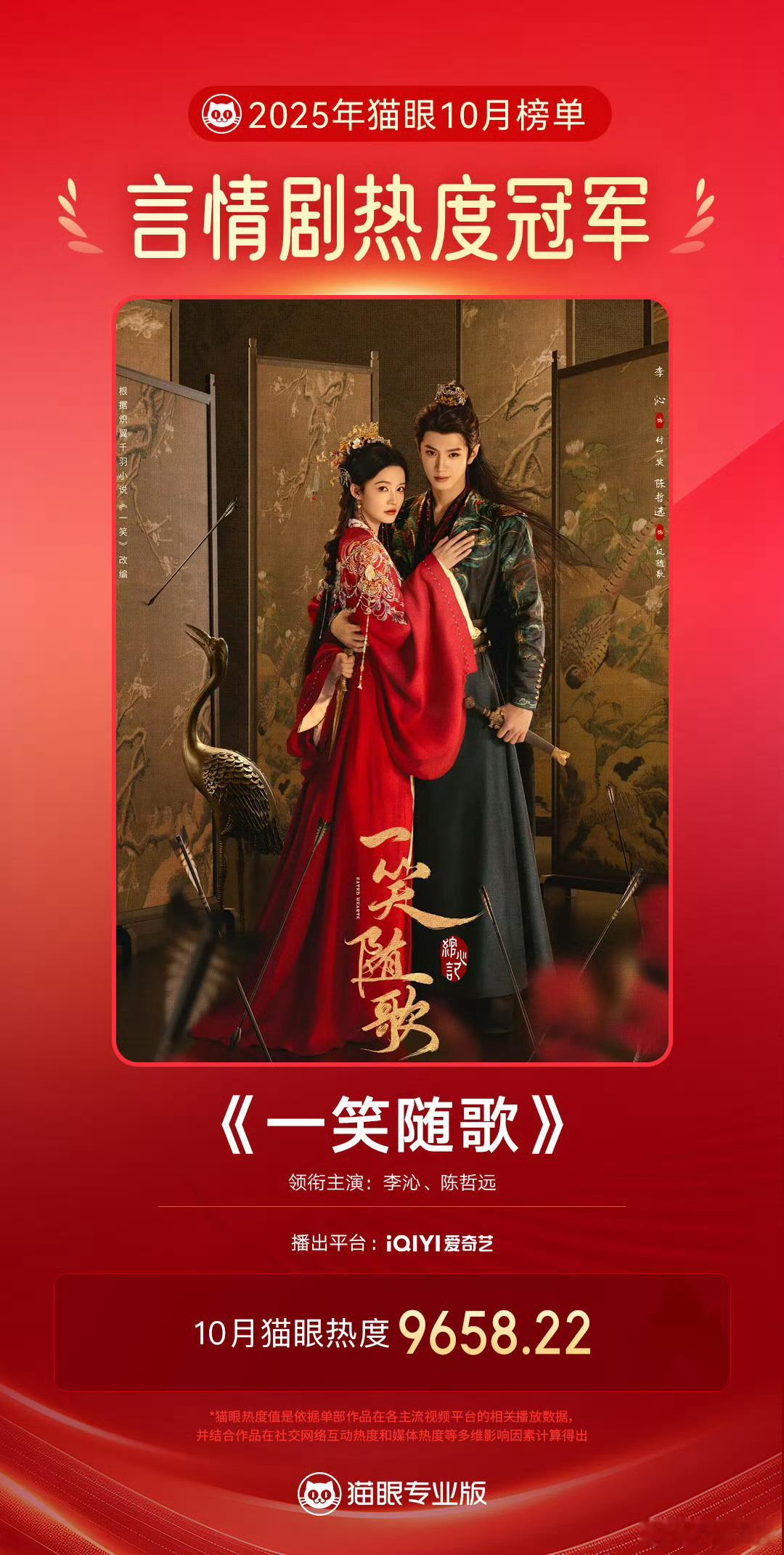 猫眼10月言情剧热度榜冠军 李沁、陈哲远《一笑随歌》