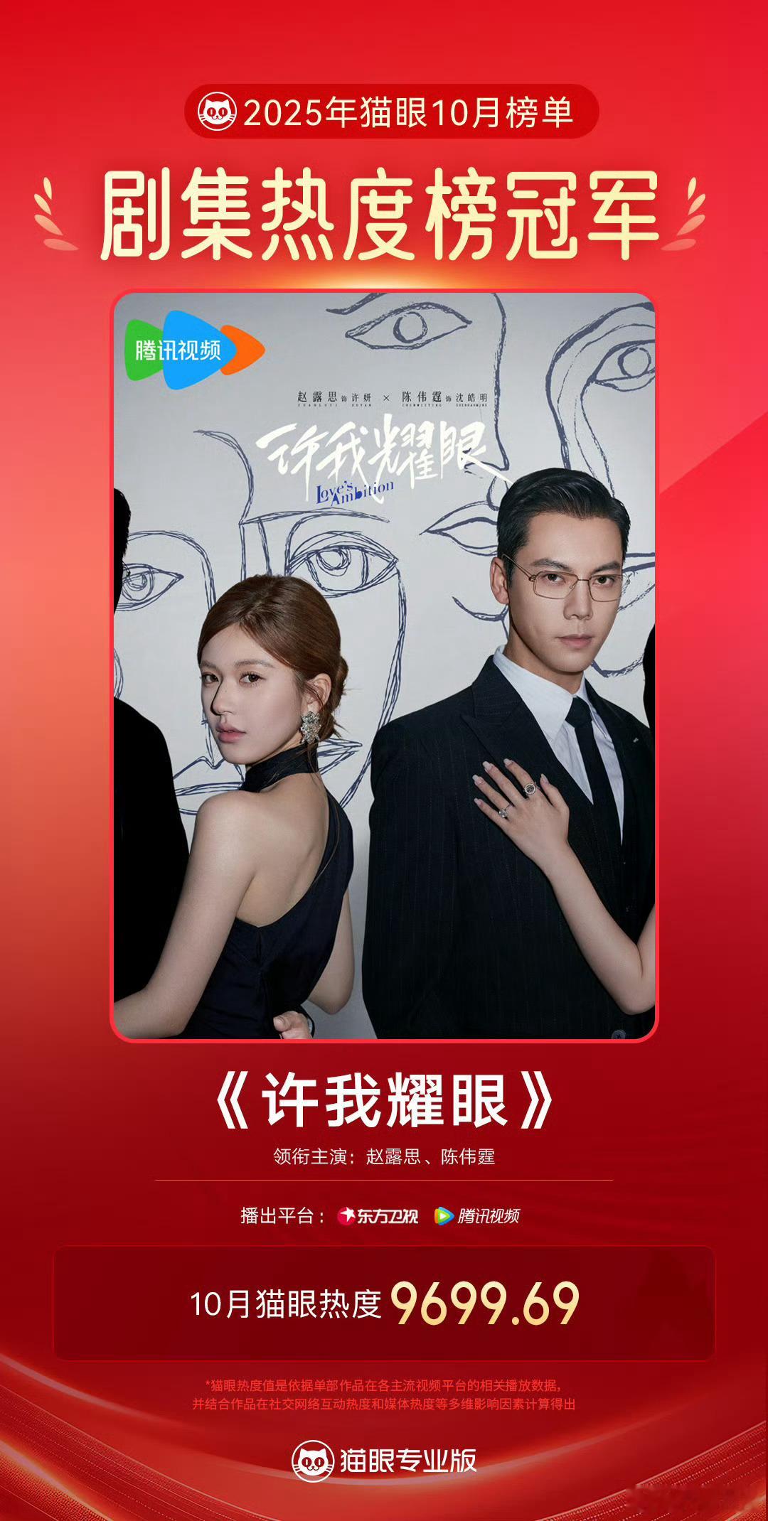 猫眼10月剧集热度总榜冠军 赵露思、陈伟霆《许我耀眼》