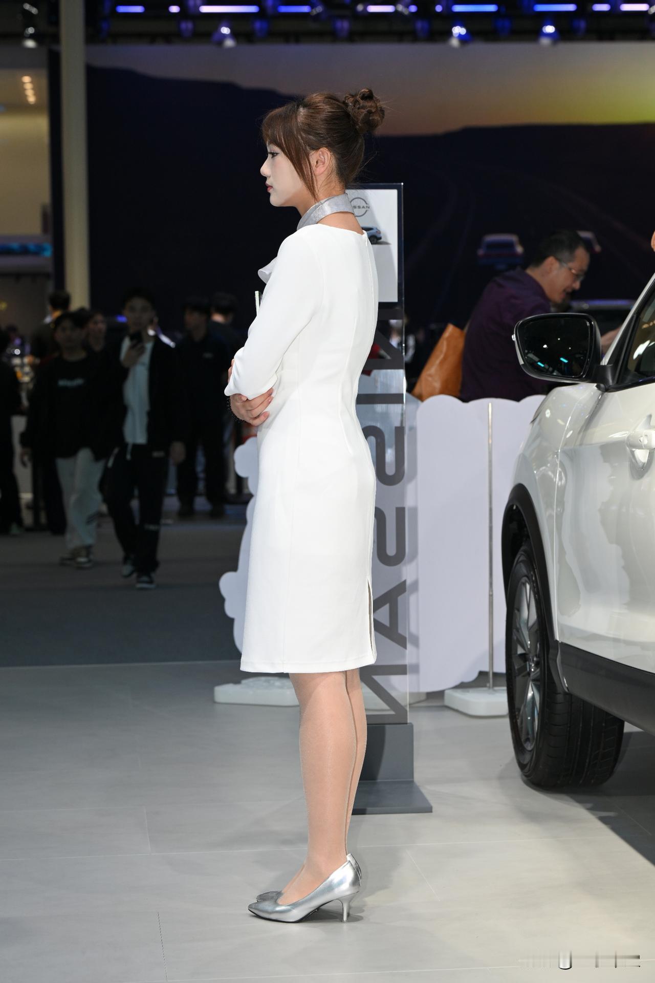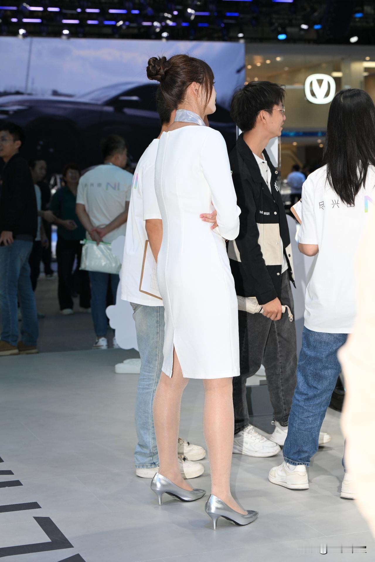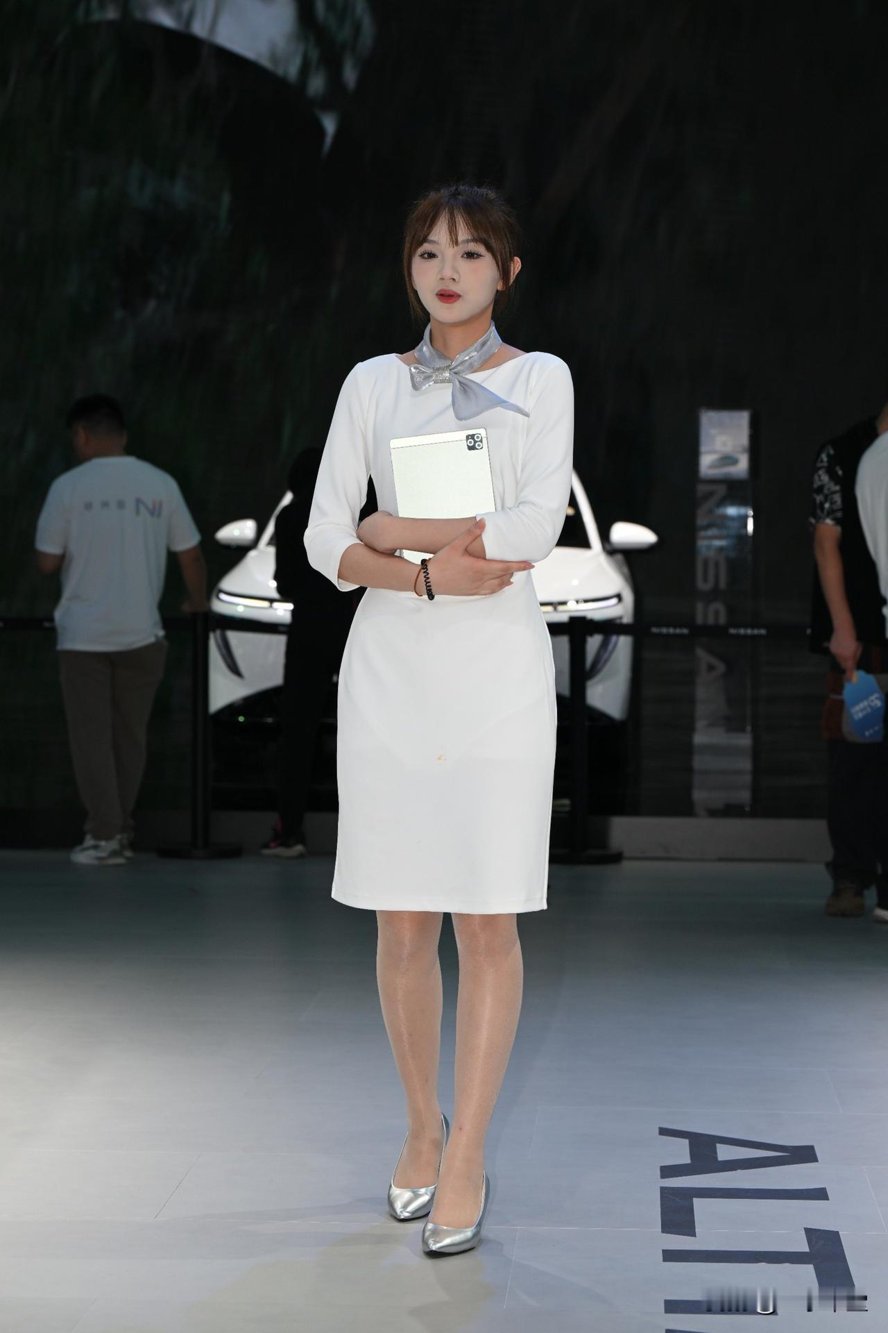 车展上的白色连衣裙清秀OL丝袜美腿小姐姐 !街拍美女好身材 美丽车模故事