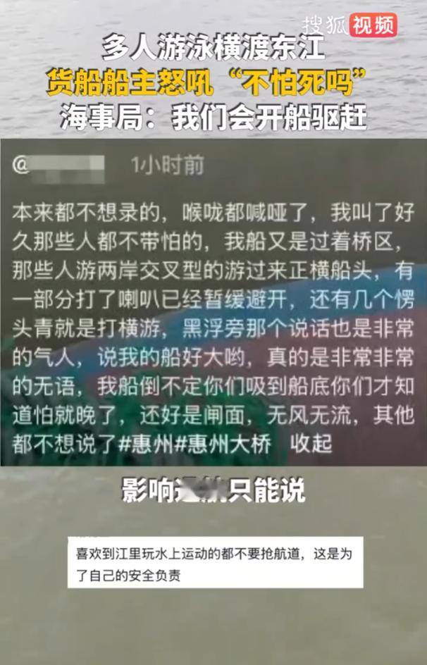 “真不怕吗?”11月1日,广东惠州,一艘货船在东江正常航行,正要穿过惠州大桥时,船头前方突然冒出几个游泳的人,他们不闪不避,几乎贴着船身继续横渡,场面令人揪心,船主在驾驶室里声嘶力竭地大喊,却依然没能阻止这场危险的“擦肩而过”,海事局:会驱赶。[得意] 这样的画面在不少航道都曾出现,船舶在行驶中会产生“船吸效应”,尤其是大吨位货船,螺旋桨形成的吸力足以将人卷入水下。 再加上船体前方存在视野盲区,驾驶员很难及时察觉近处的游泳者,一旦发生碰撞或被吸入,往往就是无法挽回的悲剧。 一部分游泳爱好者过于相信自己的技术和反应,认为能够及时避开船只;也有人心存侥幸,认为“船总会让人”,却忽略了大型船舶制动困难、转向缓慢的现实。 部分水域缺乏醒目的警示标识和物理阻隔,也为野泳者提供了空间。 虽然航道安全属海事部门职责,但对游泳行为的管理需多部门协同,目前常见的做法是发现影响通航的情况后,配合地方政府进行劝离,仅靠人力值守并不现实,关键还是要从源头提升公众的安全意识。 要真正遏制航道游泳乱象,我们或可在热门野泳点设置更醒目的警示牌,通过真实案例和示意图呈现危险;也可借鉴其他城市的经验,在重点水域加装防护网、浮标等隔离设施。 同时规划出安全的亲水区域,引导群众到指定地点游泳,引入无人机、智能摄像头等科技手段进行常态化巡查,也能提升监管效率。 与其事后追责,不如事前防范,社区、学校和媒体可以联合开展水上安全知识普及,让更多人了解航道不是泳池,而对游泳爱好者来说,选择正规场所锻炼,既是对自己负责,也是尊重他人安全。 这惊险的一幕被记录下来后,迅速在网络上发酵,众多网友在表达后怕与震惊的同时,也从不同角度发表了看法。 “这事儿看得人血压都上来了!船主嗓子都喊哑了,这些人怎么还敢往船头凑?真当货船是碰碰车啊?” “我就在惠州,东江里游泳的人一直不少,但游到主航道里的还真是头回见,这已经不是锻炼身体,简直是挑战极限了。” "作为老航运人,看得手心冒汗,船吸效应不是闹着玩的,大船经过时水流变化极大,人一旦被卷进旋涡,水性再好也白搭,而且船长视野有盲区,根本看不到船头正下方的情况。" "惠州大桥那段江面平时很多运沙船,速度虽然不快,但吨位都很大,这些游泳者可能觉得船会避让他们,可货船转向有多难他们根本不知道!" "说句不好听的,这是对自己不负责,也是对船主不负责,真出了事,船主要不要担责?人家好好开着船,凭什么要为这种冒险行为提心吊胆?" "不能让自己的任性成为别人的负担"。 "其实下游三公里就有正规泳场,门票才20块,为什么非要冒险在航道里游?说到底还是规则意识太淡薄了。" “这种行为极其危险且不可取,我们担心的不只是游泳者自身安全,还有事件背后的公共安全问题和管理漏洞。” “可能有些人确实不了解危险,但也有人存在侥幸心理,觉得不会发生在自己身上,这种心理才是最可怕的。” 如果你在现场,会怎么劝阻这些游泳者?或者你有什么好办法,能从根本上避免这种危险行为?欢迎在评论区分享你的观点~ 信源:搜狐新闻