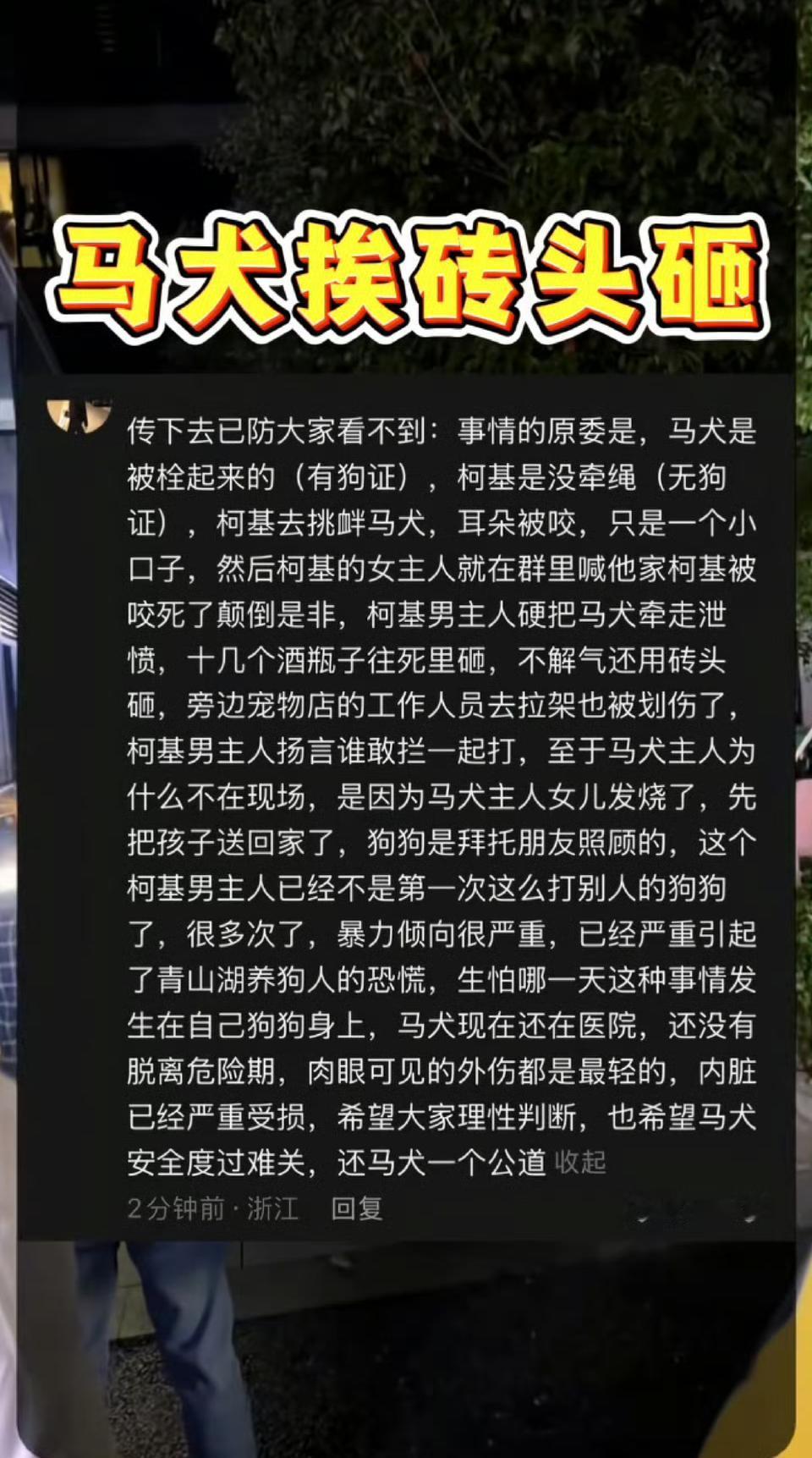 刺耳的狗叫声穿透街头,只见一名男子正疯狂地用酒瓶、砖头猛砸一条被铁链拴在树干上的马犬,狗狗的惨叫声听得人头皮发麻,全程足足持续了20分钟,任凭围观者怎么劝阻都没用。这是发生在杭州街头的真实一幕。 事情的起因是两只狗发生冲突,柯基主人声称自家爱犬被马犬“咬死”,可警方调查后却来了个大反转:柯基其实只是耳朵轻微受伤,而且事发时根本没按规定拴绳,反倒是被打的马犬全程拴着狗链,如今还在宠物医院抢救,肺出血、内脏受损,至今没脱离危险期。马犬主人说,当时他正抱着生病的两岁女儿遛狗,发现狗冲突后想先送孩子回家再协商,没想到回头就得知自家狗被如此残忍对待。 狗狗是生命,不是让人发泄怒火的工具,哪怕是动物间的冲突,也不该用如此残忍的手段报复。更让人无语的是,这件事里柯基主人本身就没遵守遛狗规则,不拴绳的柯基引发冲突,却把所有怒火都撒在拴绳的马犬身上,甚至还谎称柯基“被咬死”博同情,这操作实在让人不齿。 更让人深思的是,类似的宠物纠纷暴力事件并不是第一次发生。之前还有爷爷因为未拴绳的宠物狗吓哭孙女,就当场把狗摔死的事,同样引发了巨大争议。 现在柯基主人的行为已经涉嫌故意损毁公私财物,等待他的将是法律的处罚。 来源:搜狐千里眼