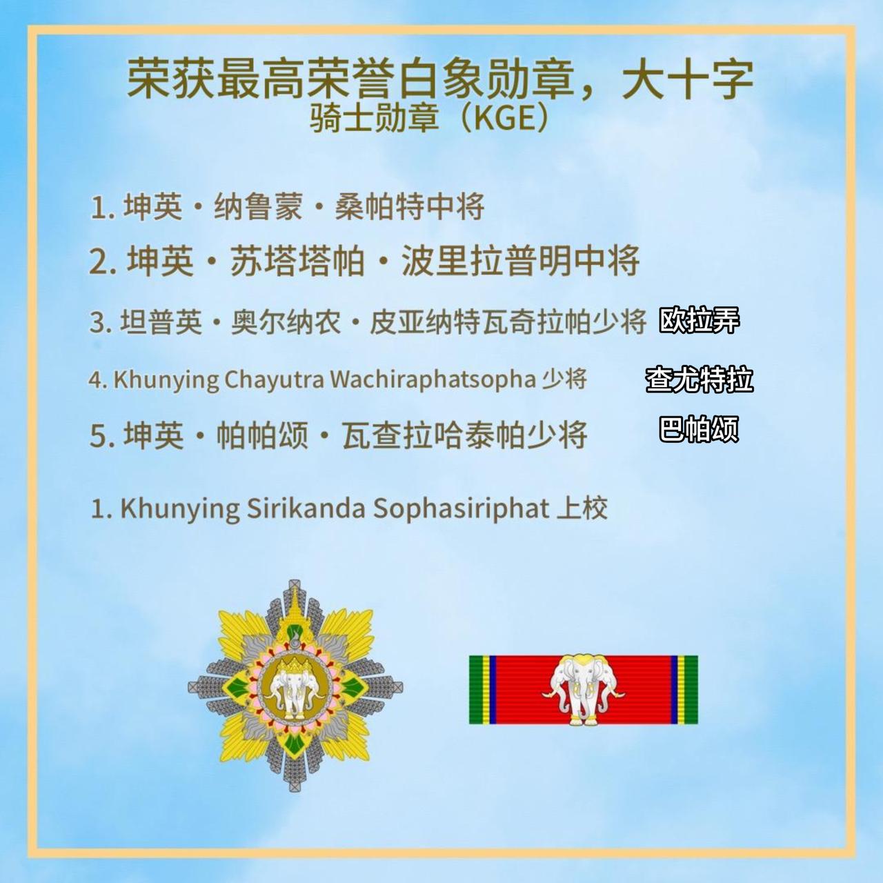 后宫三位女眷,欧拉弄的地位最尊贵 泰王给三位妾室发了新勋章,那欧拉弄还排在最前面呢,地位一看就不一般!而且这三位妾室都有专属徽印,这可是泰国王室的老传统啦,这么一来,不就等于承认她们是正式王室成员了嘛。