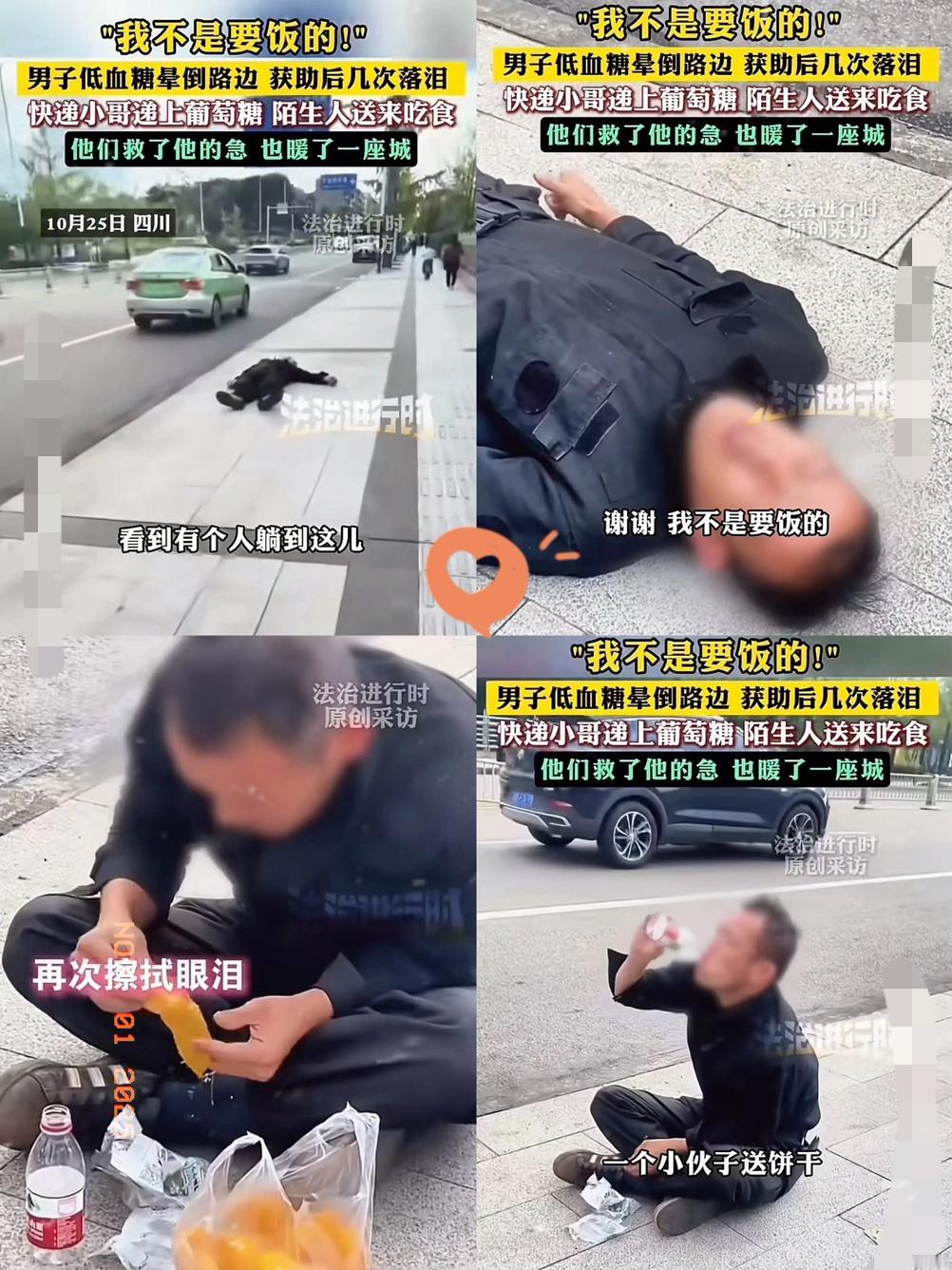 四川街头这幕看得人心里暖暖的! 男子低血糖晕倒在路边,路人要帮叫120, 他却虚弱地摆手——哪是不害怕啊,是舍不得救护车的钱! 还好有个大姐没撒手,一看是低血糖,立马喊着帮找糖 路过的快递小哥直接掏出口袋里的葡萄糖,小心喂他喝 没一会儿,又有小伙子送来了饼干,还轻声劝“慢点吃,别噎着” 另一个大姐更实在,直接买了一大袋面包蛋糕递过去。 男子一开始还不好意思说“我不是要饭的”,可看着这些递过来的食物,眼泪直打转。 这哪是施舍啊?是陌生人怕他饿、怕他难受,掏心掏肺的关照! 其实城市的温暖从来不是靠高楼撑起来的,是靠这些见人难就伸手的普通人。 你们平时遇到过这样的善意吗?哪怕只是一句关心的话,是不是也能记好久?