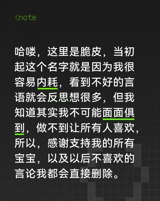 哈喽,这里是脆皮,当初起这个名字就是因为我很容易内耗,看到不好的言语就会反思想很多,但我知道其实我不可能面面俱到,做不到让所有人喜欢,所以,感谢支持我的所有宝宝,以及以后不喜欢的、吵架的言论我都会直接删除,不喜欢我的可以直接拉黑。这里是我的故事,他们是我的主角。也麻烦我可爱的宝宝们一件事,看到不好的言论不用替厨子争辩,我真的不希望看到任何人争执。告诉我删掉就好。谢谢宝宝们。