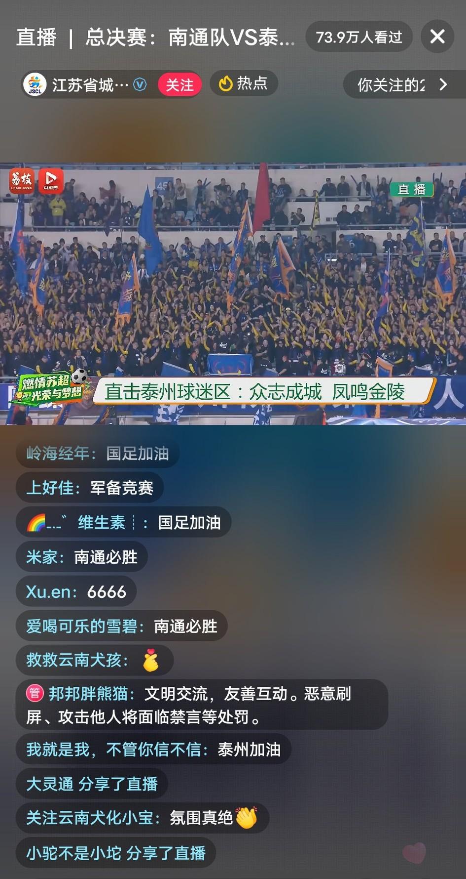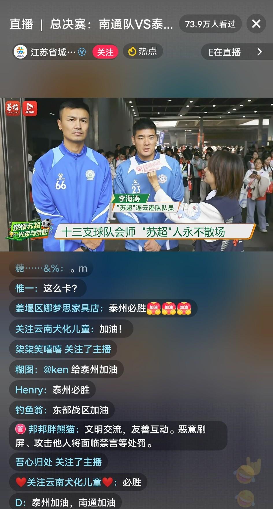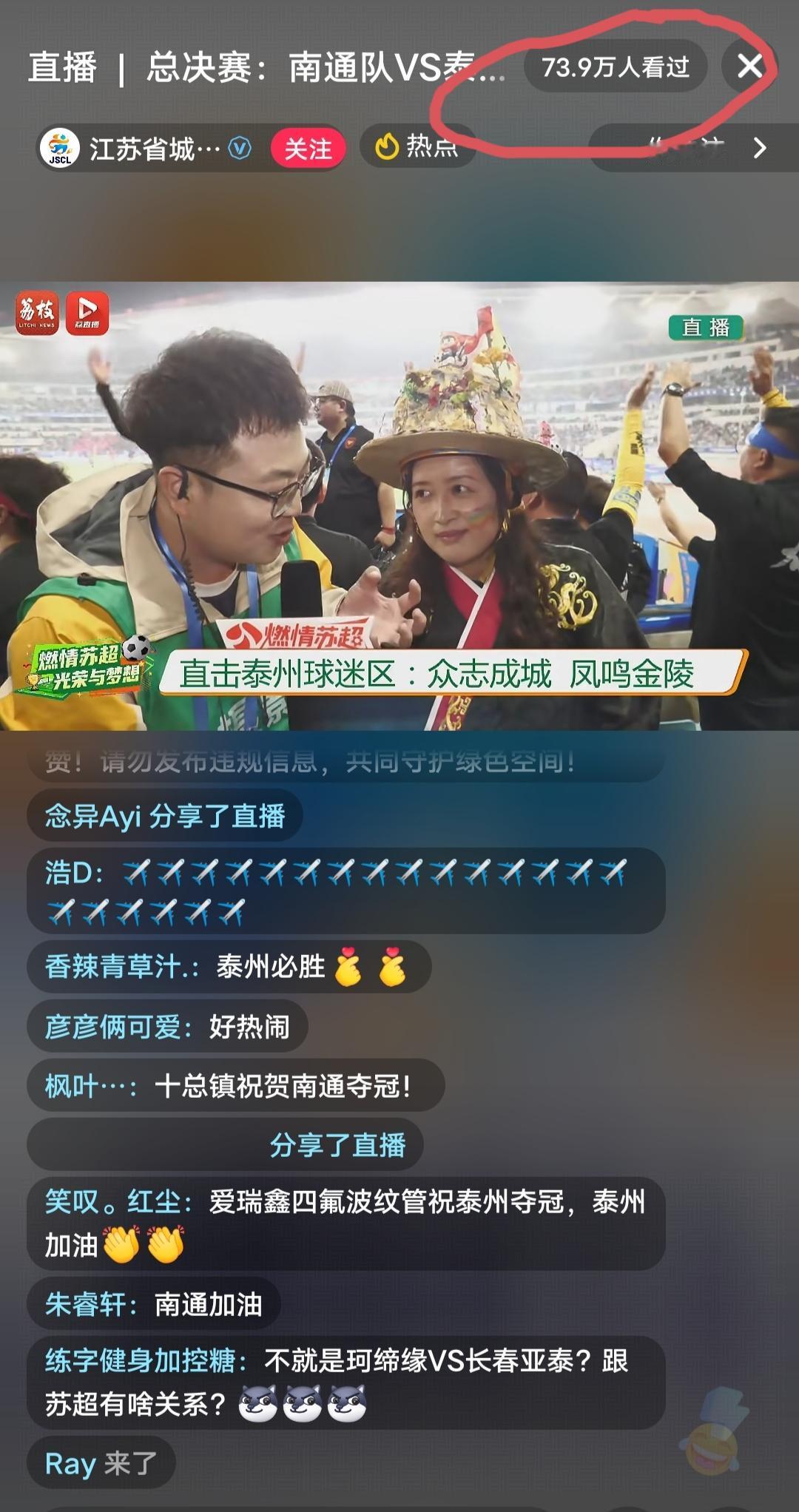 苏超决赛江苏荔枝台的直播间观看人数今晚能到几百万?一百万、两百万?创造苏超记录是肯定的,会不会创造中国足球史上的一个记录? 现在比赛差不多还要一个小时开打,目前直播间的观看人数已经达到80万+了。 现在接下去的舞台就交给南通队和泰州队的球员了,相信他们一定会为我们奉献上一场激情四射的对决,因为“此时不搏,更待何时”! 泰州儿郎们,为家乡父老乡亲挣面子的时候到了,你们一定行,加油!!!