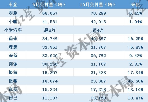 10月新势力车企销量出炉!零跑月销量首破7万辆,蔚来、小鹏、小米均破4万辆