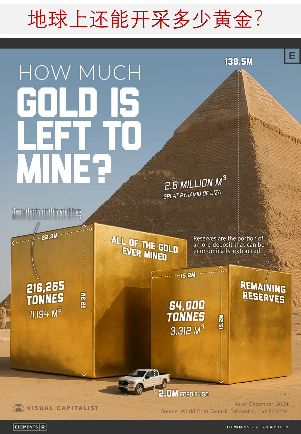 全球已经开采了多少黄金?地球上还能开采多少黄金? 黄金的稀缺性是其仍被视为热门避险资产的一个原因。在 2025 年,这种金属经历了多年来最强劲的上涨行情,涨幅超过 50%,因为全球投资者对全球经济的不确定性做出了反应。 如果将所有开采出的黄金全部熔化在一起(约 216,000 吨),那么这些黄金形成的立方体高度将仅有 22 米,大约相当于四层楼的高度。 与此同时,全球已探明且具有经济开采价值的黄金储量总计约 64,000 吨,这些黄金储量可堆叠成一个边长为 15 米的立方体。 在这张信息图中,参考了世界黄金协会和美国地质调查局(USGS)提供的数据,并结合了《大英百科全书》中的相关历史背景信息,以使黄金的总量情况更加清晰明了。 ——现存黄金量及剩余黄金量是多少 据统计,所有开采出的黄金一共约 216,000 吨,据有关资料,全球已探明且具有经济开采价值的黄金储量总计约 64,000 吨。 目前已知的大部分黄金资源已经开采殆尽。随着新发现的矿藏越来越少,且开采成本不断上升,人们越来越将注意力转向黄金的回收利用以及改进回收技术上。 ——现代主导了大部分的开采活动 自 1950 年以来,人类开采的所有黄金中有三分之二都是在这一时期开采出来的,这得益于技术进步和工业需求的推动。战后时期出现了大规模的露天矿场和高效的精炼技术。如今,由于矿石品位下降,开采速度正在放缓,但每年的地上黄金存量仍在缓慢增长。 在所有开采出的黄金中,约 45% 用于制作珠宝,而 22% 以金条和金币的形式存在。各国央行总共拥有约 17% 的黄金,将其作为抵御通货膨胀和地缘政治不稳定的战略手段。黄金还用于科技和其他行业,为电子设备和航空航天部件提供动力。 ——2025 年黄金的上涨行情 2025 年,黄金价格首次突破 4000 美元,因为投资者纷纷寻求美元贬值、地缘政治动荡和经济不确定性所带来的避险资产。 与此同时,随着美国对俄罗斯的严厉制裁措施出台,中国及其他国家已开始减少对美国国债的依赖,转而投资黄金。此外,散户投资者也纷纷涌入黄金市场,将其作为对抗持续高通胀的对冲工具。 ——还能找到更多的黄金吗? 尽管地下的黄金储量约为 64,000 吨,但这并未涵盖所有剩余的黄金,还有更多的未被发现的金矿资源存在。 随着黄金价格的上涨,规模较小或品位较低的金矿开采变得更具经济可行性。高昂的价格也激励着勘探者去寻找更多的黄金,从而带来新的发现。