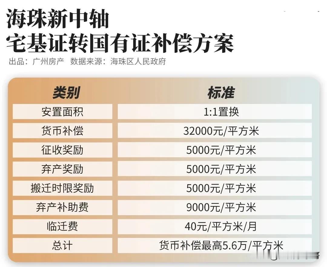 最高5.6万!广州海珠多个旧改征收补偿方案确定! 海珠新中轴片区改造(东风村、红卫村、三滘村)征收补偿标准尘埃落定。 集体土地弃产补偿,相比之前提高不少,达到2.5万每平方。集体土地非住宅房屋,如果选择房票安置,则不再享受额外奖励。 宅基证转国有证产权补偿,安置面积1:1置换,弃产补偿最高5.6万/㎡。如果选择复建房安置,公摊部分按照面积差额4500元/㎡的标准支付。 这两个补偿方案如此之高,放在全市也是数一数二,就算是本区的康鹭片区旧改、沥滘村也是望尘兴叹! 也正因为如此,作为近几年来广州市区投入规模最大的旧改,海珠新中轴拆迁推进速度如火箭,已拆除面积约62万方,占首期任务量约70%。 所以真金白银的付出,村民还是非常愿意拆的。