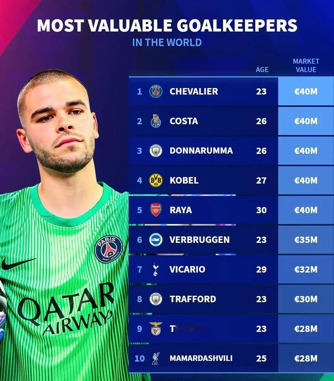 在完成最新一次身价更新后,德国转会市场网站列出了世界足坛门将身价榜,大巴黎门将舍瓦利耶以4000万欧位列第一。