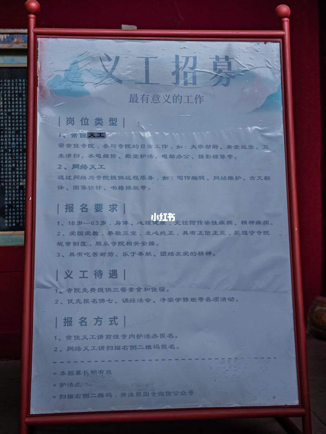成都近郊|千年古寺|寺庙义工|避暑 🍃悠悠的夏日,在声声虫鸣声中不期而至。在这炎夏之中,如果能在一座清凉山中幽静的寺庙,来一场义工旅居之旅,那是再好不过的了‼️ 🌲充满负氧离子的森林之中,佛音袅袅,是心灵和身体的多重疗养💐 🕴文旅君这次造访的这座寺庙🏯,可能是我迄今为止见到过最专业的的寺庙义工招募了~竟然还可以远程哦 . 📍地点:四川乐至报国寺 🚗自驾:成都出发1.5H,重庆出发2.5H 🚌公交:🎈成都茶店子车站、金沙汽车站、城东汽车站等每天都有几十班客车去乐至,车票33-49元 🎈重庆汽车站、陈家坪客运站每天有10几班客车去乐至,车票45-64元 🎈乐至县城有到(龙门乡)报国寺的中巴,每半小时一班。非常方便 . ✅✅✅义工项目推荐特色: 1⃣森林般的禅修环境 乐至报国寺始建于隋朝,历史悠久,是四川省文物保护单位。寺庙坐落于群山之间,被诸多古树名木环绕,空气清新,风景极佳 . 2⃣不限所在地 乐至报国寺接受常驻义工和网络义工,也就是说既能做现场义工,还可以远程义工哦‼️ . 3⃣义工职责明确 寺庙会根据每个人的特长,为大家安排诸如帮厨、寻堂、清洁、水电、护法、电脑、摄影摄像、编辑、网站维护、图像设计等对口的义工岗位~ . 4⃣完全免费 寺庙为义工提供免费三餐和住宿,大家看一看图3,容我猜一猜这是义工的住宿环境吗?简直秒杀一众度假山庄啊🏞 . ⏰ 年龄要求:18-63岁 📮 申请方式:关注“乐志报国寺”公众号,有专门的义工申请页面 📮 详情请见图2 .