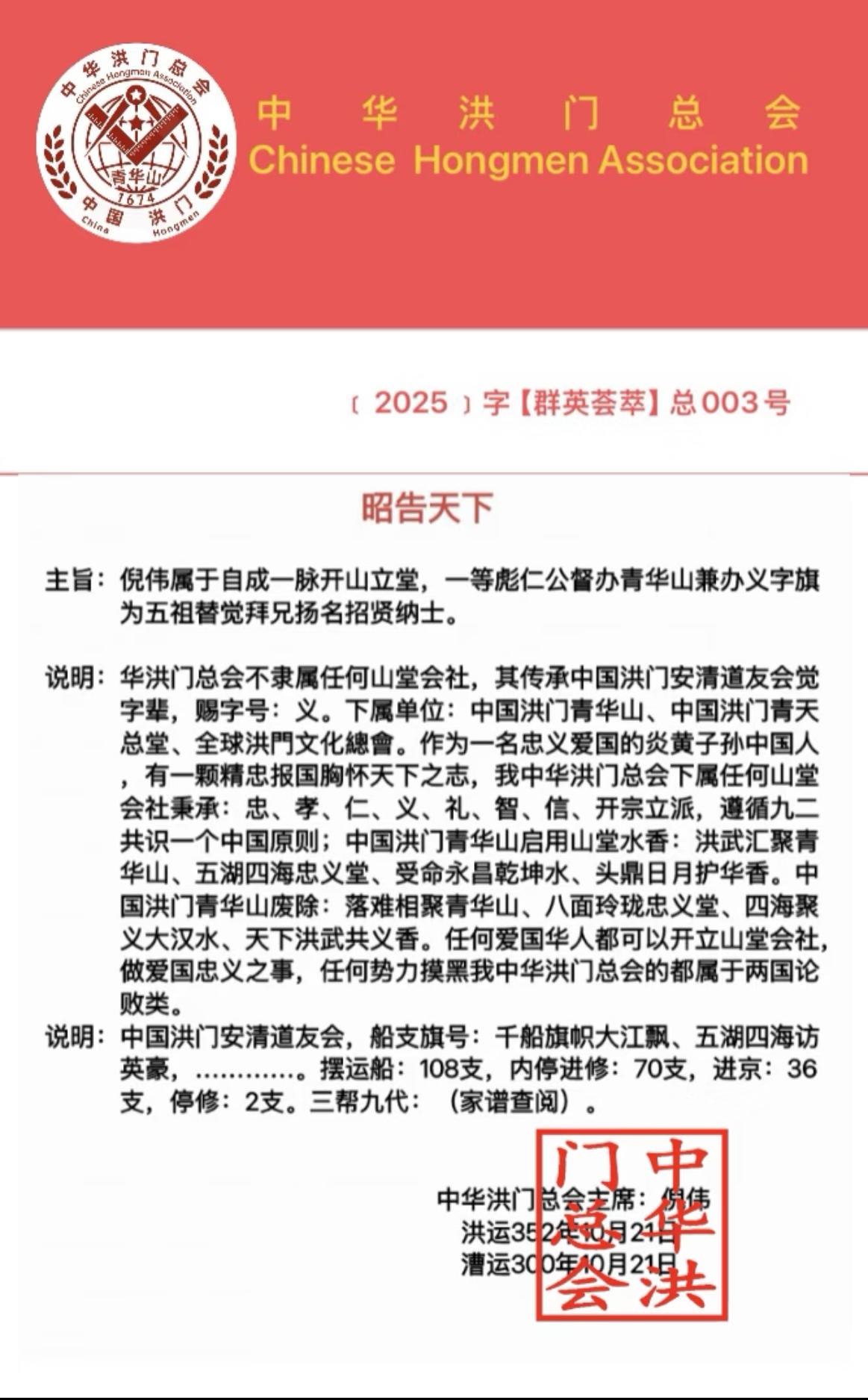 洪门要开大会, 赖清德要紧张了! 国际洪门中华总会发出邀请, 洪门要于2025年11月8日下午18时,在台北市一会馆,举行“2025坚持九二共识,维护两岸和平,促进国家统一”大会。这下子,赖清德这个台独头子,要紧张了。 一直以来,岛内统派力量看似分散,实则暗流涌动。 国际洪门中华总会作为岛内首个合法登记的洪门团体,以“复兴民族振兴中华”为理念,长期坚持九二共识、反独促统,在推动两岸经贸文化交流上贡献颇多。 此次高调举办大会,就是要向“台独”势力亮明态度:统一是历史大势,任何分裂行径都绝无可能得逞。 赖清德之流若还执迷不悟,妄图在“台独”绝路上越走越远,等待他们的必将是历史的审判。 两岸统一是全体中华儿女的共同心愿,洪门都已行动起来,那些“台独”分子还能蹦跶多久? 大家觉得赖清德会如何应对这场“危机”呢? 台湾回归颂 世界洪门总会 洪门会 中华洪门总会 台工委