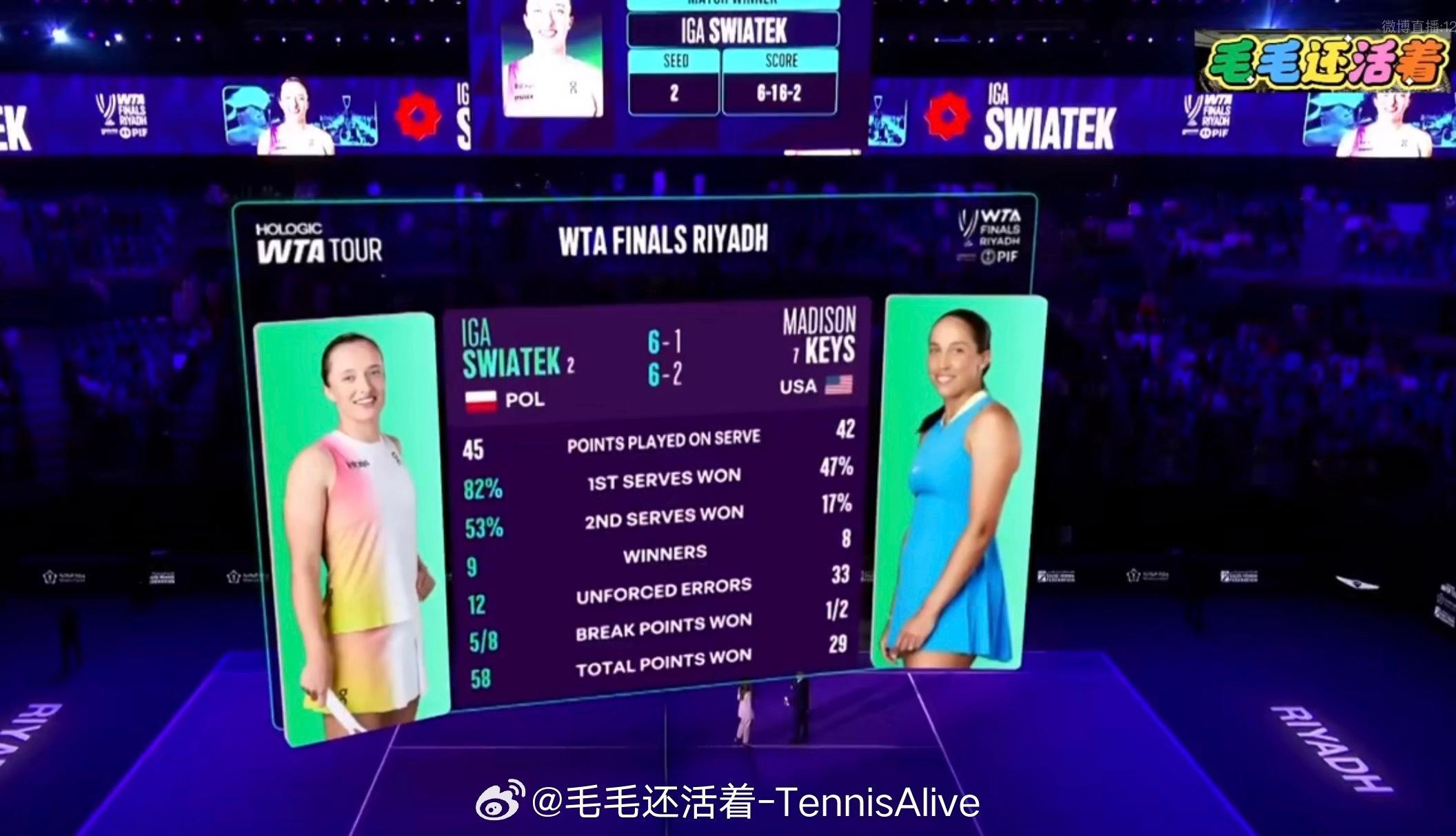 凯斯33记非受迫性失误,送走了自己。这场比赛是斯瓦泰克全面占优的比赛。凯斯休息时间很长,顺便改了发球动作。显然她有些准备不足,状态也没能适应。