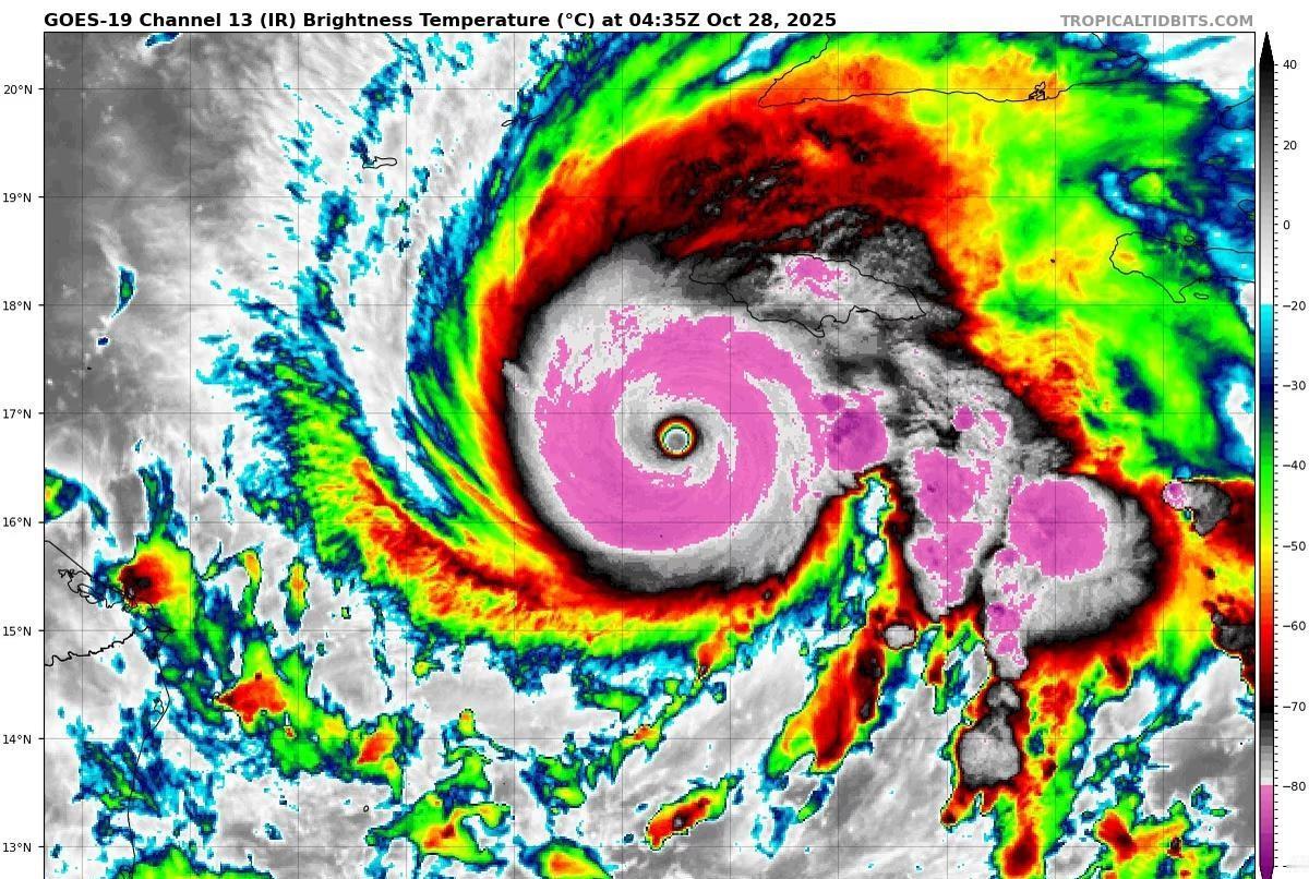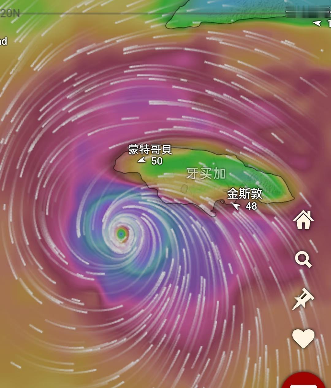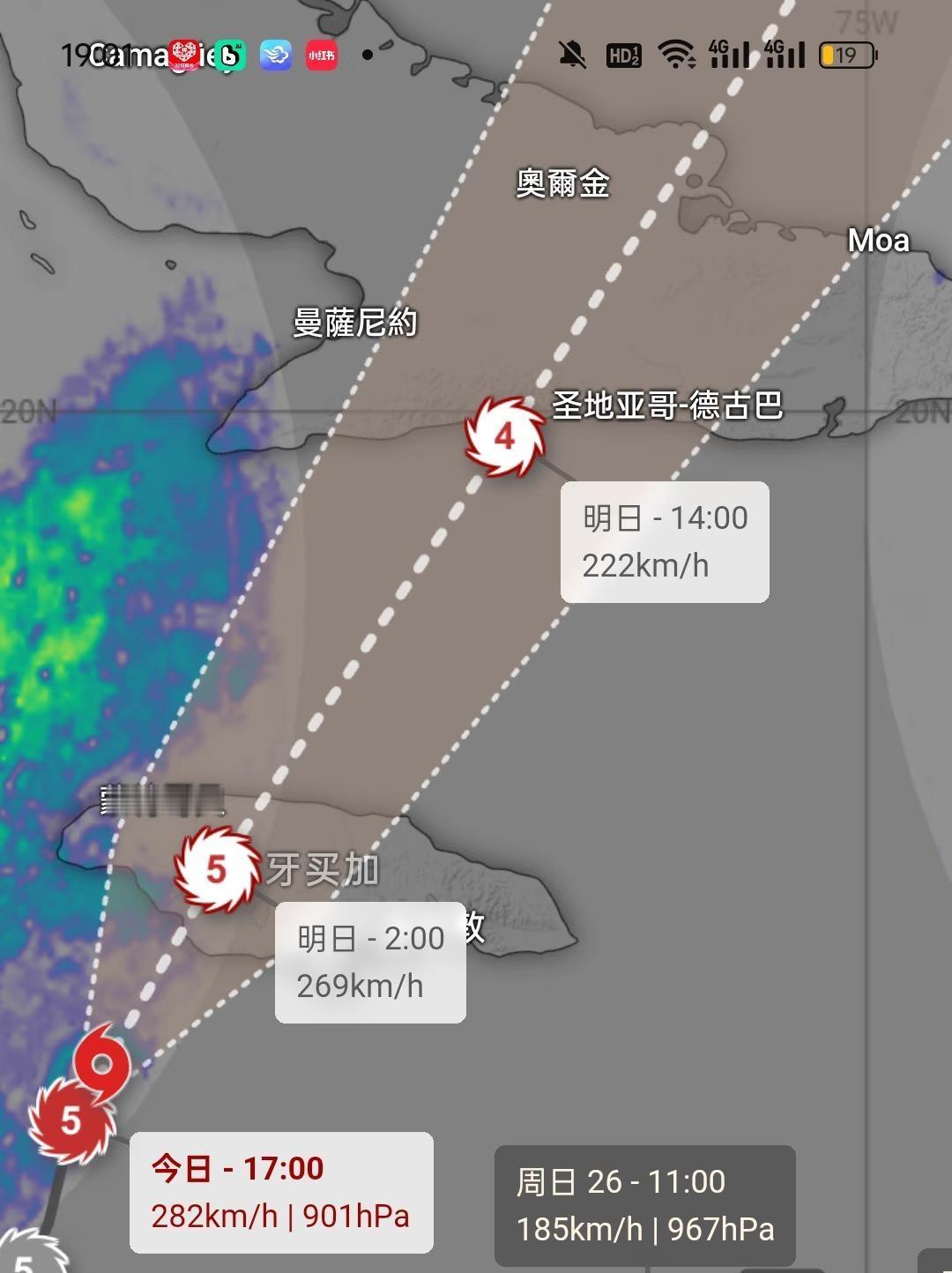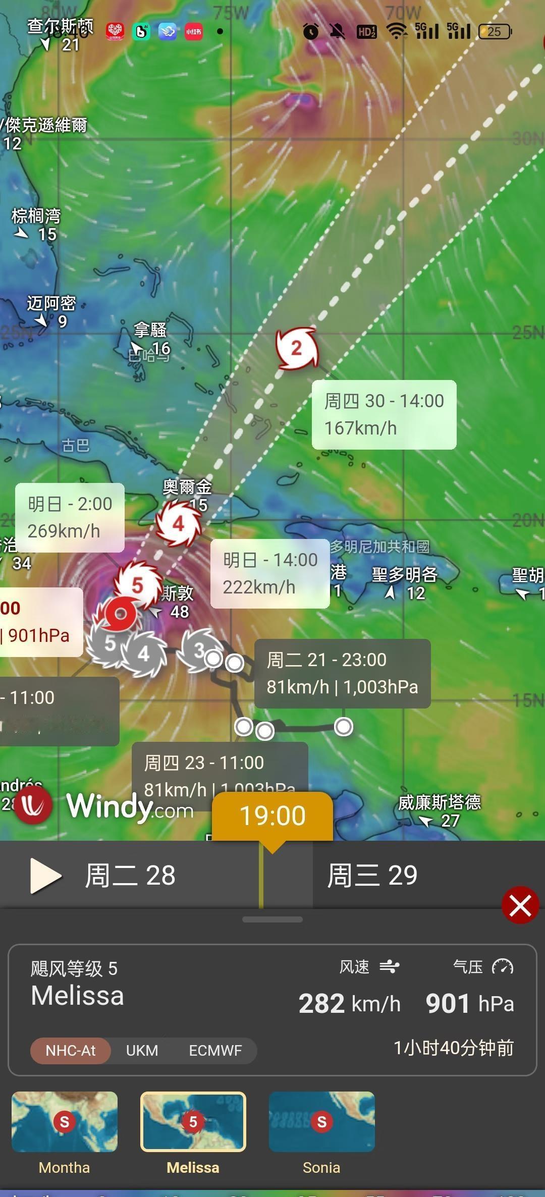 飓风melissa这是真的太厉害了 在北大西洋的这个飓风melissa,已经达到5级飓风级别了,现在风速282km每小时气压901hpa,和桦加沙不相上下,看windy明天会以5级飓风登陆牙买加,可能会有很大风雨啊😦飓风