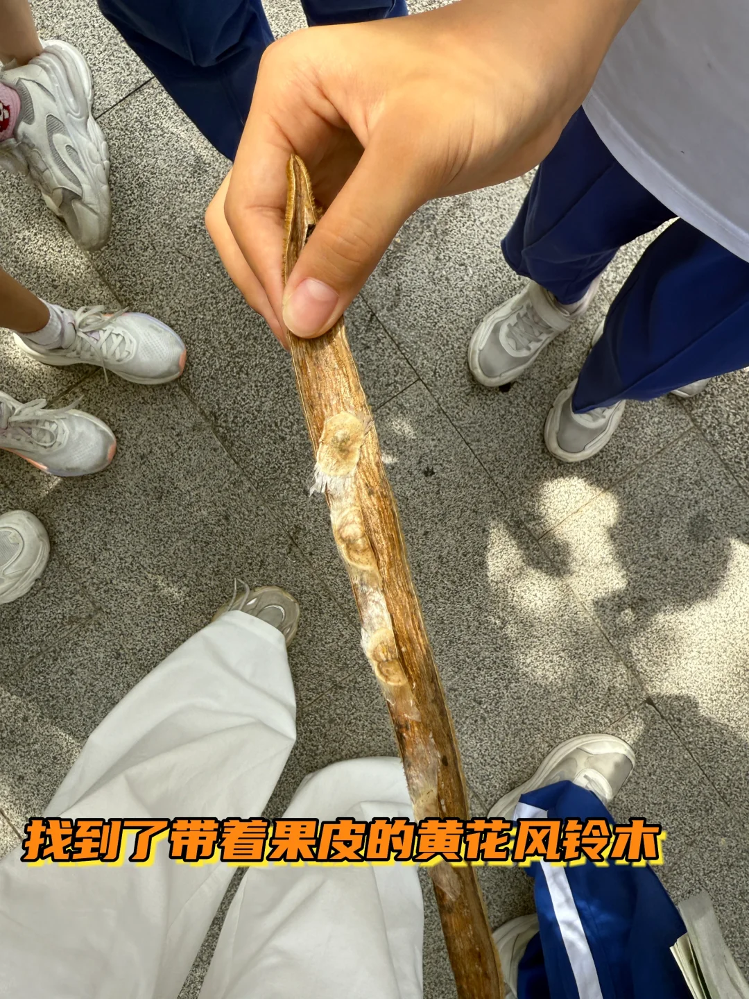 有的班很幸运,地板上的羊蹄甲种子和果皮没被扫走,可以啪啪一顿踩、捡一堆种子回去