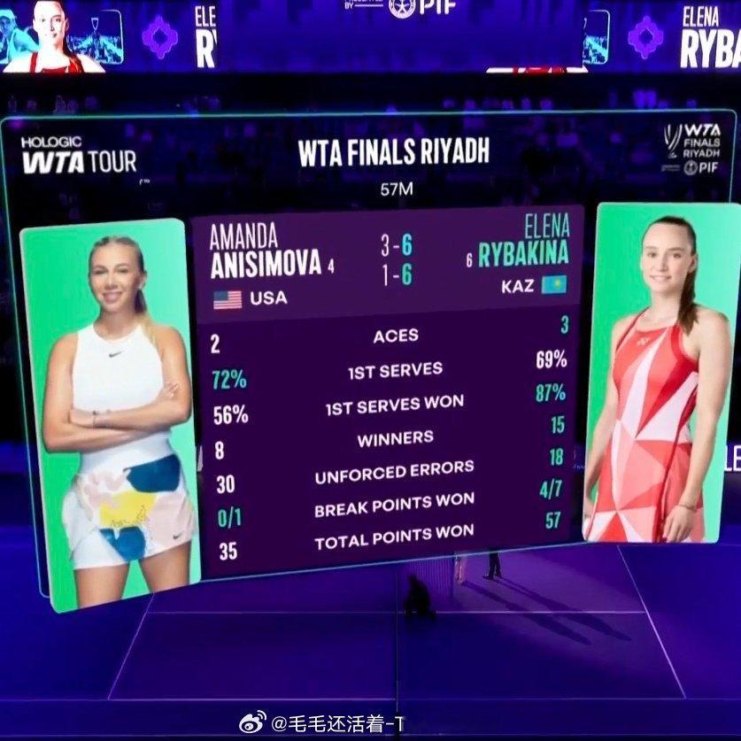 今天莱巴金娜的一发得分率高达87%。15记制胜分只有18记非受迫性失误。总得分比阿尼西莫娃多出22分。完全钻娜,延续了宁波东京的状态。