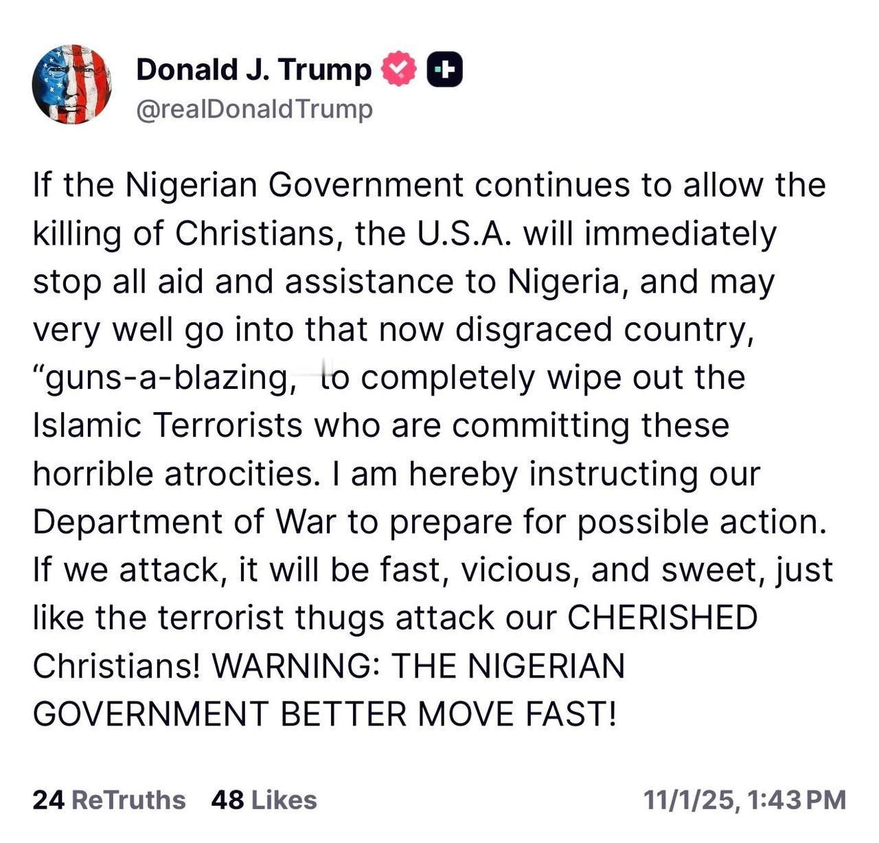 特朗普总统威胁称,如果尼日利亚政府不制止极端主义袭击,他将扣留约10亿美元的援助,并威胁在尼日利亚境内采取军事行动。 总统特别提到了基督徒,但有证据和数据表明,基督徒和穆斯林都在遭到杀害。