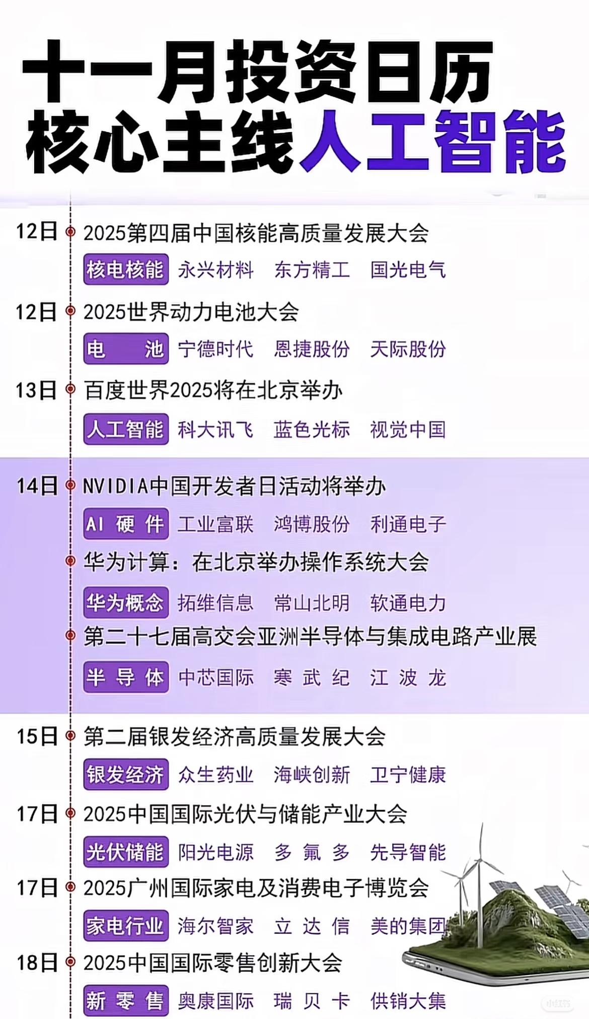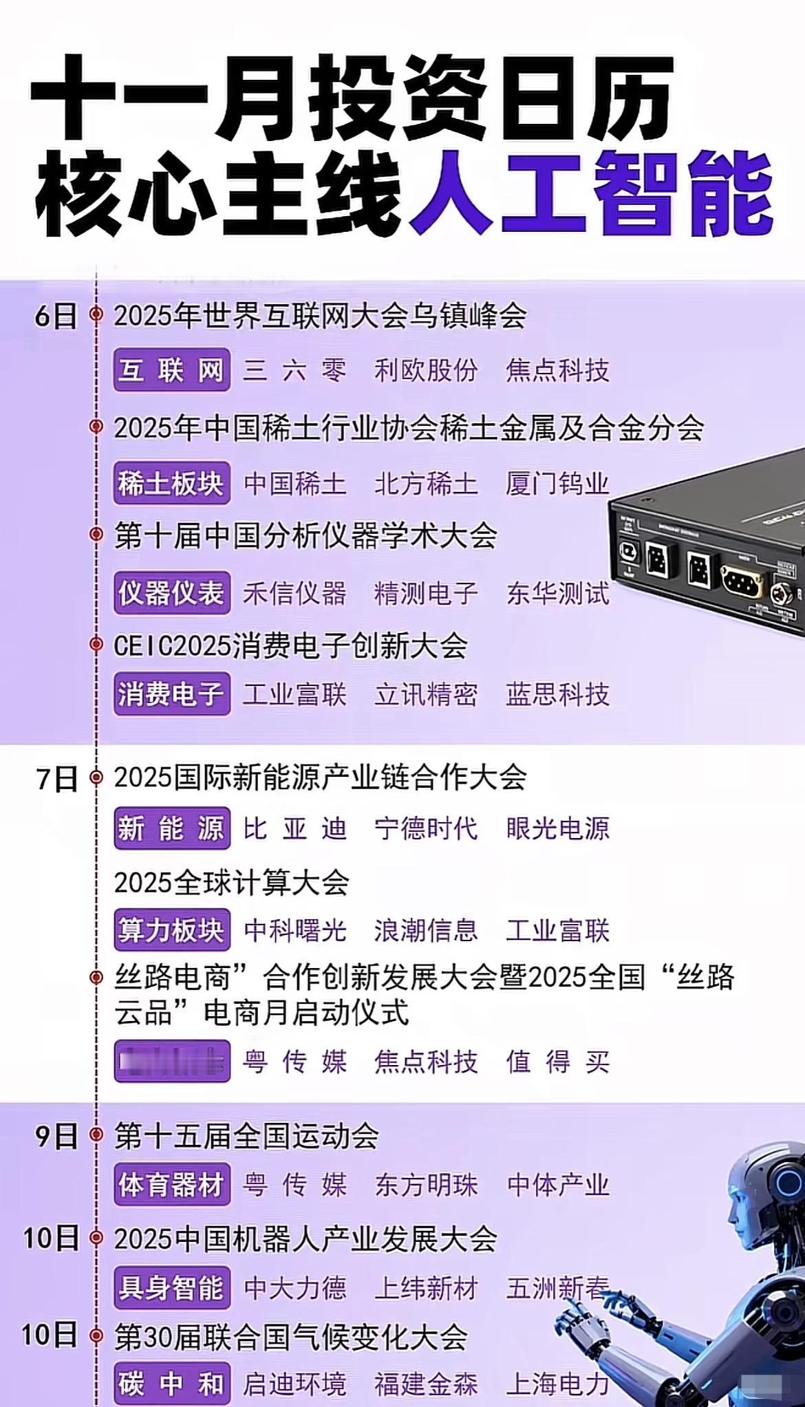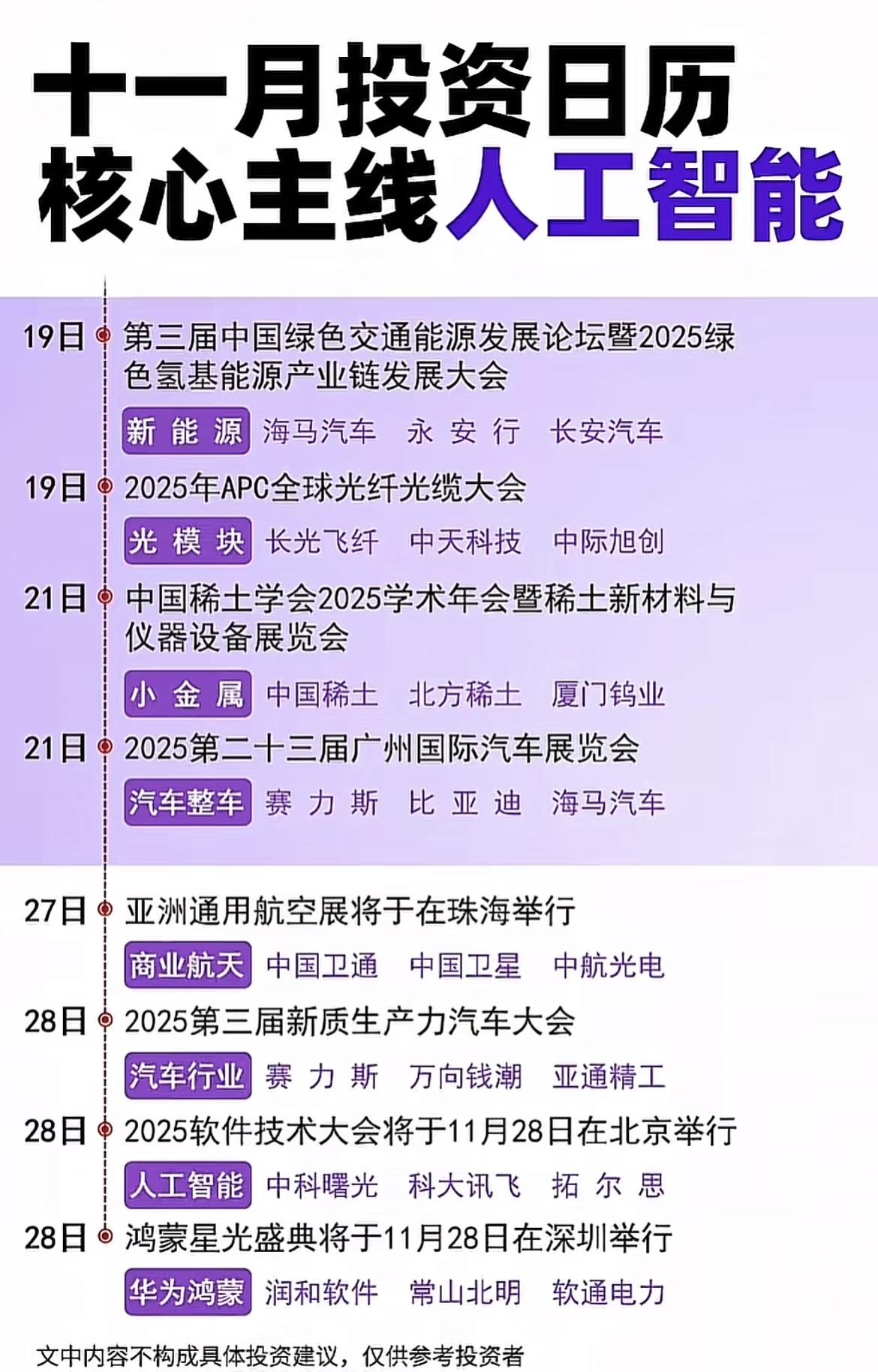 “十一月投资日历”图片均以“核心主线人工智能”为主题,按日期详细梳理了2025年11月期间的重要行业会议、展览、论坛及重大活动,并标注了每个事件所关联的主要行业板块及代表性企业,为投资者提供了当月热点领域的投资参考方向。 11月1日焦点是小度AI眼镜开启预售,带动AI眼镜板块(如水晶光电、恒玄科技、博士眼镜),同时还有智能技术与大数据会议(涉及中科曙光、寒武纪、海光信息)。2日有电池技术论坛(聚焦固态电池,关联宁德时代、国轩高科、天际股份)及国际金融领袖投资峰会(金融板块,如中信证券、东方财富、农业银行)。4日金蝶全球创见者大会推动AI+应用相关企业(如用友网络、鼎捷软件、致远互联),5日进博会则聚焦外贸板块(如跨境通、中远海控、上海物贸),同日还有测绘地理信息大会(关联中科星图、测绘股份、华测导航)。 6日世界互联网大会乌镇峰会是重点,覆盖互联网、稀土、仪器仪表及消费电子板块(如三六零、中国稀土、禾信仪器、工业富联等),同时还有关于稀土金属的专门会议(涉及北方稀土、厦门钨业)及分析仪器、消费电子创新大会。7日国际新能源产业链合作大会关注新能源、算力及电商概念(如比亚迪、中科曙光、粤传媒等),9-10日则有全运会(体育器材,如东方明珠、中体产业)、机器人产业发展大会(具身智能,如中大力德、上纬新材)及联合国气候变化大会(碳中和,如启迪环境、福建金森、上海电力)。 12日聚焦中国核能高质量发展大会(核电核能,如永兴材料、国光电气)和世界动力电池大会(电池,如宁德时代、天际股份、恩捷股份),13日百度世界2025大会推动人工智能板块(如科大讯飞、蓝色光标、视觉中国),同日还有NVIDIA开发者日(AI硬件,如工业富联、鸿博股份)及华为操作系统大会(华为概念,如拓维信息、常山北明)。14日高交会亚洲半导体展关注半导体行业(如中芯国际、寒武纪、江波龙)。15日银发经济大会涉及相关医疗健康领域(如众生药业、卫宁健康),17日光伏储能大会(如阳光电源、多氟多)和家电消费电子博览会(如海尔智家、美的集团)并重,18日零售创新大会则聚焦新零售板块(如奥康国际、供销大集)。 下旬重点包括19日绿色交通能源论坛(新能源、光模块,如海马汽车、中际旭创)、20日光纤光缆大会(光模块,如中天科技、长光飞纤),21日中国稀土学会年会(小金属,如中国稀土、厦门钨业)和广州国际车展(汽车整车,如赛力斯、比亚迪),27日亚洲通用航空展(商业航天,如中国卫通、中航光电),28日则有多场重磅活动——新质生产力汽车大会(汽车行业,如赛力斯、万向钱潮)、软件技术大会(人工智能,如中科曙光、科大讯飞)以及鸿蒙星光盛典(华为鸿蒙,如润和软件、常山北明)。 整体来看,11月投资日历围绕“人工智能”这一核心主线,覆盖了从智能硬件(AI眼镜、算力硬件)、新能源(电池、光伏、氢能)、互联网与数字经济(互联网大会、电商、软件技术)、高端制造(半导体、机器人、核能)、消费电子与汽车(车展、智能汽车)、绿色低碳(碳中和、绿色交通)到金融、体育、零售等多个热门领域,通过密集的行业会议与展会活动,展现了当月资本市场关注的重点方向和投资机遇,相关企业及板块值得投资者持续跟踪。需特别说明的是,图中内容仅供参考,不构成具体投资建议。