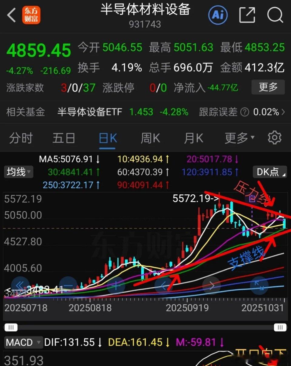 3,半导体材料设备,日线走势如下图3所示,中证半导体材料设备周五大跌超4%,正好处在 30日线上方,也没有跌破上升趋势线。不好的是macd快慢线开口向下,30-60分钟macd没有回调到位,下周初有可能继续回调,希望能在10月23日低点止跌。不好的是下方有个缺口距离目前大约有2%,缺口引力icon不小。下周前半周大概率继续回调,后半周有可能回升。