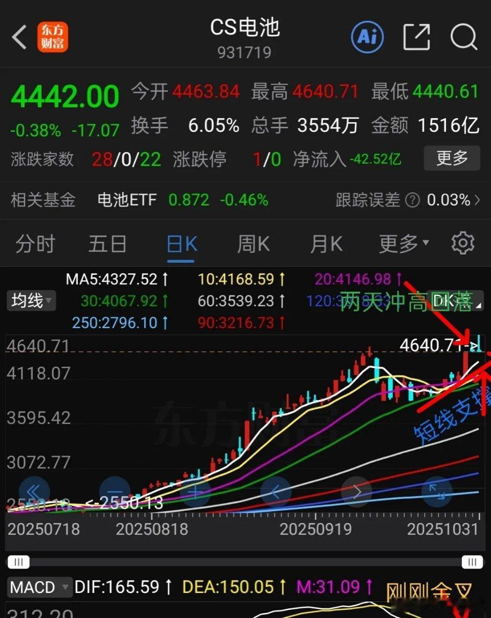 2,中证icon电池,日线走势如下图2所示,近期表现比较强势,本周4-5由于大盘不配合,连续两天冲高回落,留下上影线,说明主力资金在做高抛低吸,短线有回调需求,先看5日线支撑力度,大约有2.6%,最多回踩下方10日线支撑大约6%。新能源电池长期看好,可分期逢跌低吸。本人本周已经做了止盈减仓,下周择机接回。只要5周线不破可继续持仓待涨。