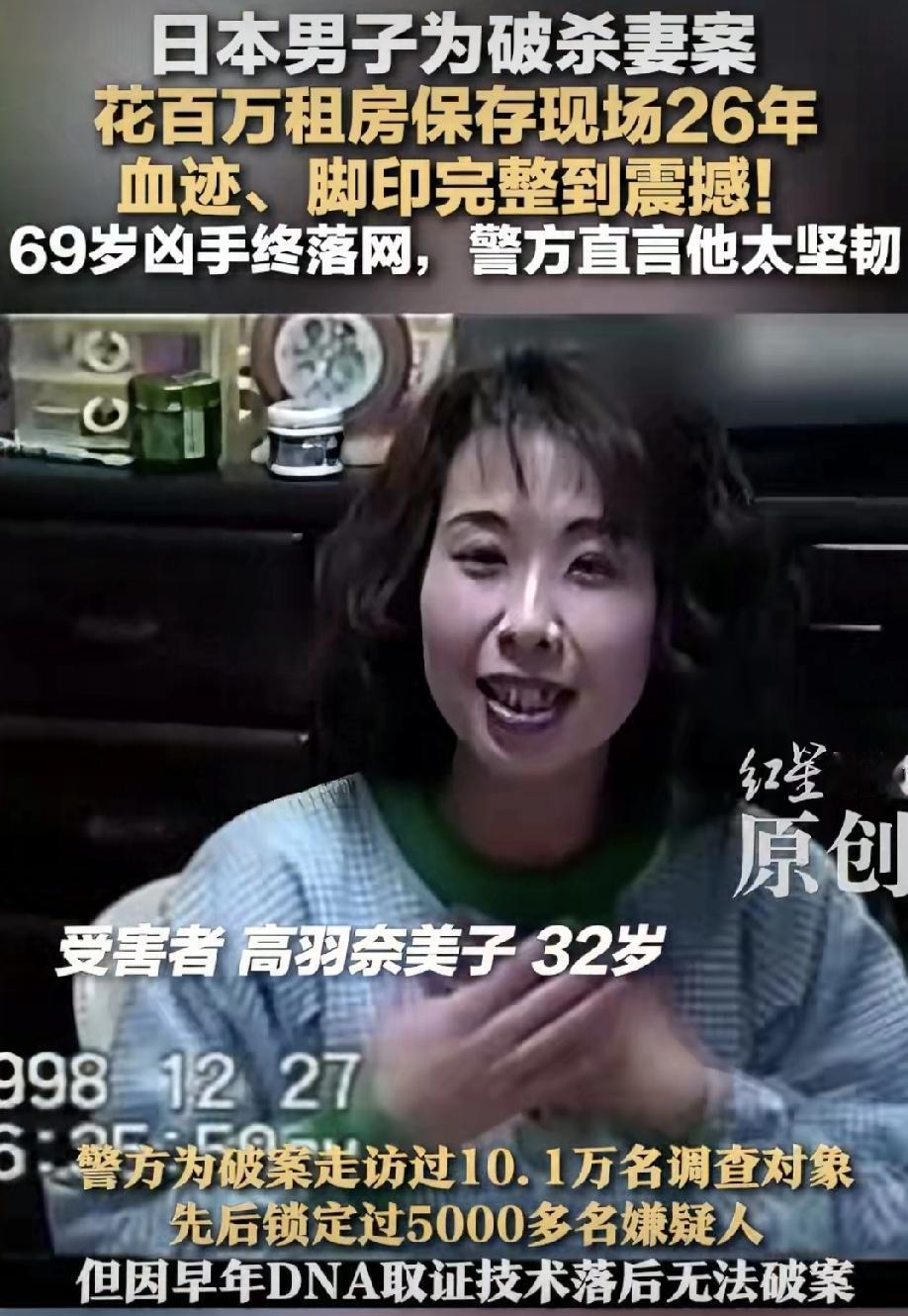 1999年,日本名古屋的一名32岁女性高羽奈美子在家中遇害,现场只留下2岁的儿子和满屋血迹。她的丈夫高羽悟做了一个让所有人震惊的决定:保留命案现场原样,一留就是26年。 这26年里,他继续租着那间公寓,哪怕花费超过2000万日元(约102万人民币),也坚持不清理血迹、不动任何痕迹。他说,这是为了给警方留下最完整的证据,等一个真相。 警方曾排查10万多人,锁定过5000多名嫌疑人,却因早年技术有限迟迟未破案。直到今年,69岁的凶手安福久美子终于认罪——她是高羽悟的高中同学,杀人动机竟源于“私人感情”。 破案后,高羽悟只说了一句:“现在我终于可以打扫房间了。” 简单一句话,藏着26年的执念。有人说这是爱情的坚守,也有人说是对正义的死磕。但无论如何,这份近乎偏执的坚持,等来了迟到的结局。 有些承诺,时间才能证明。